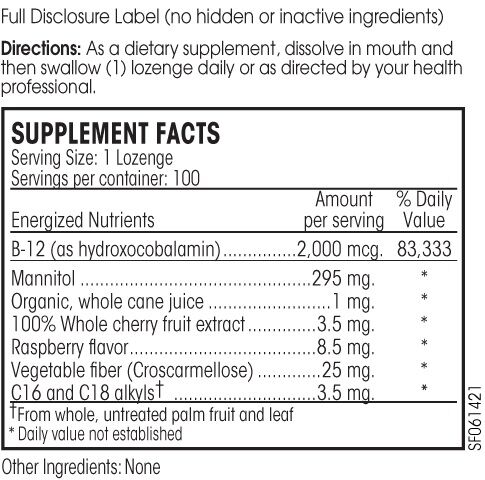 B-12 (as hydroxocobalamin), Mannitol, Organic whole cane juice, 100% whole cherry fruit extract, Raspberry flavour, Vegetable fiber croscarmellose), C16 andalkyl†
