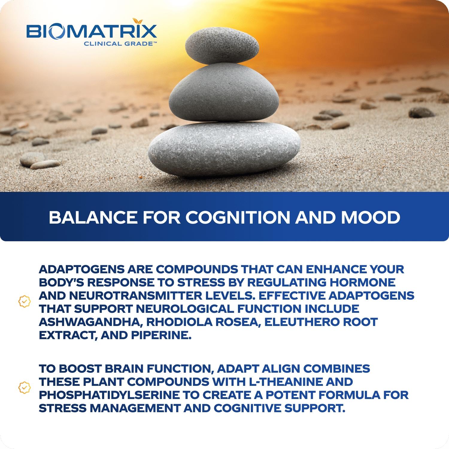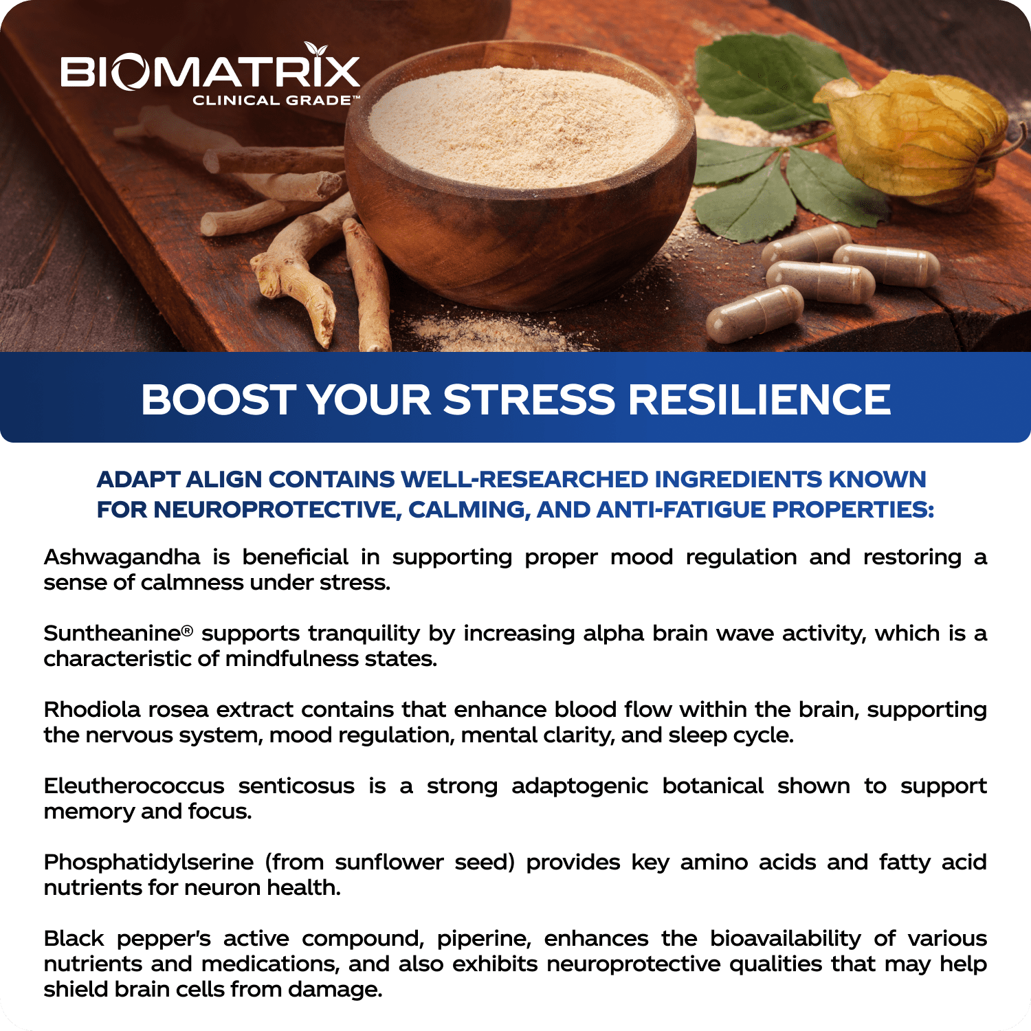 Adapt Align boost cognitive function and sustain energy levels with the support of ashwagandha and other adaptogens, which help improve mental clarity. Benefit from piperine, recognized for enhancing nutrient absorption, memory and overall cognitive performance. Promote relaxation and support brain health with l-theanine and phosphorylated serine, which also aid in stress response. Rejuvenate both body and mind with ginseng and rhodiola, known for their fatigue fighting properties and ability to support a healthy nervous system