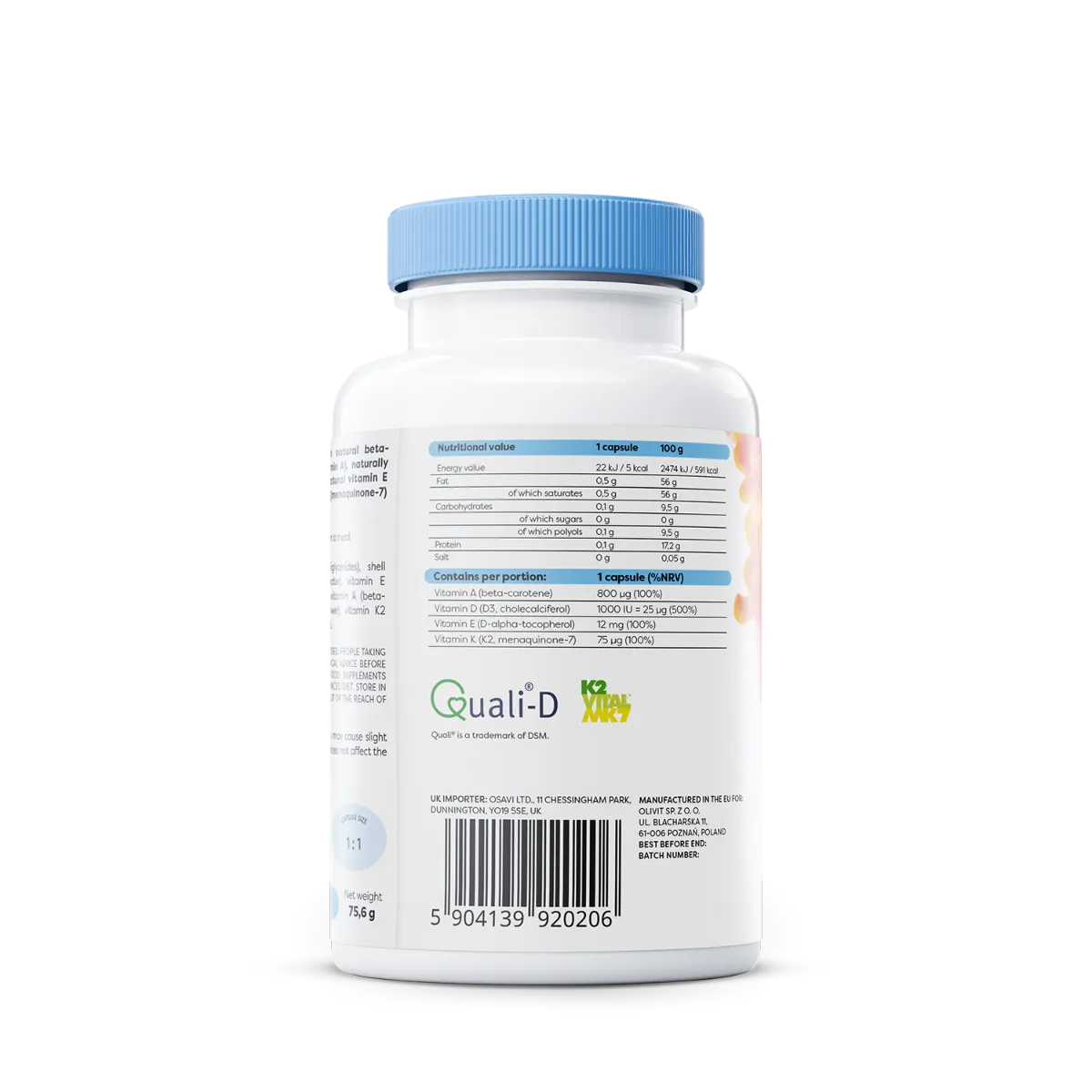 This softgel supplement contains natural beta-carotene (provitamin A) from algae D. salina, naturally derived vitamin D3, vitamin E (D-alpha-tocopherol) and vitamin K2 (menaquinone-7) dissolved in MCT oil from coconut. Vitamin A and D support immune system function, while vitamins D and K help maintain healthy bones. Vitamin D also supports teeth and muscle function, vitamin A promotes healthy mucous membranes, skin and vision and vitamin E protects cells from oxidative stress