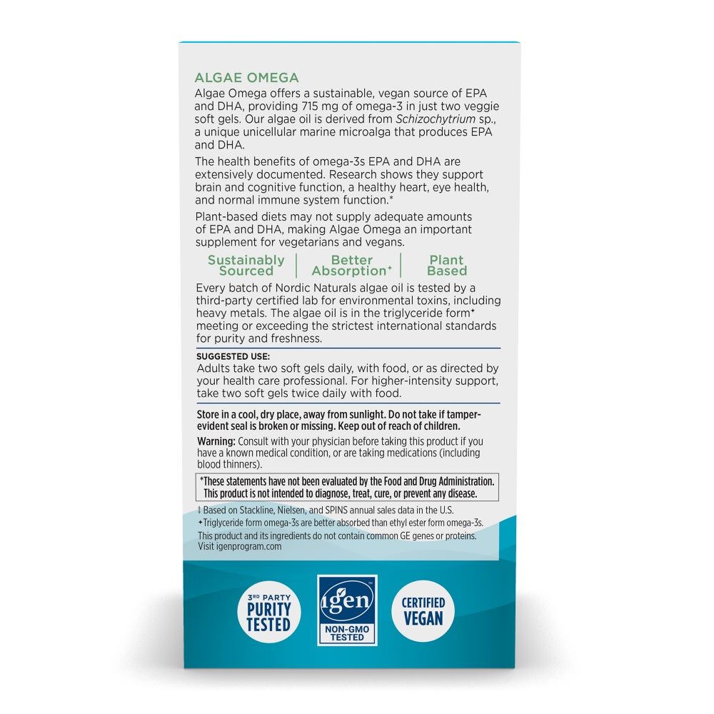 Algae Omega provides vegetarians and vegans with a sustainable, Non-GMO source of omega 3 EPA and DHA, supporting heart, brain and immune health with 715mg of total omega 3s per serving