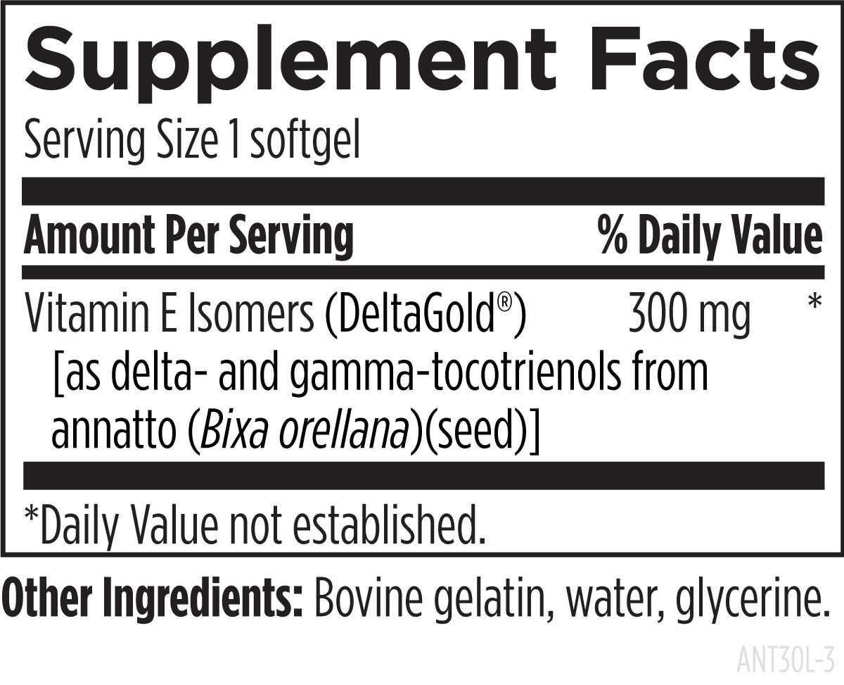Each softgel contains 300mg of delta and gamma tocotrienols (90% delta-isomers, 10% gamma-isomers), with no tocopherols included, as research indicates that tocopherols—especially alpha-tocopherol—may interfere with the unique health benefits of tocotrienols.