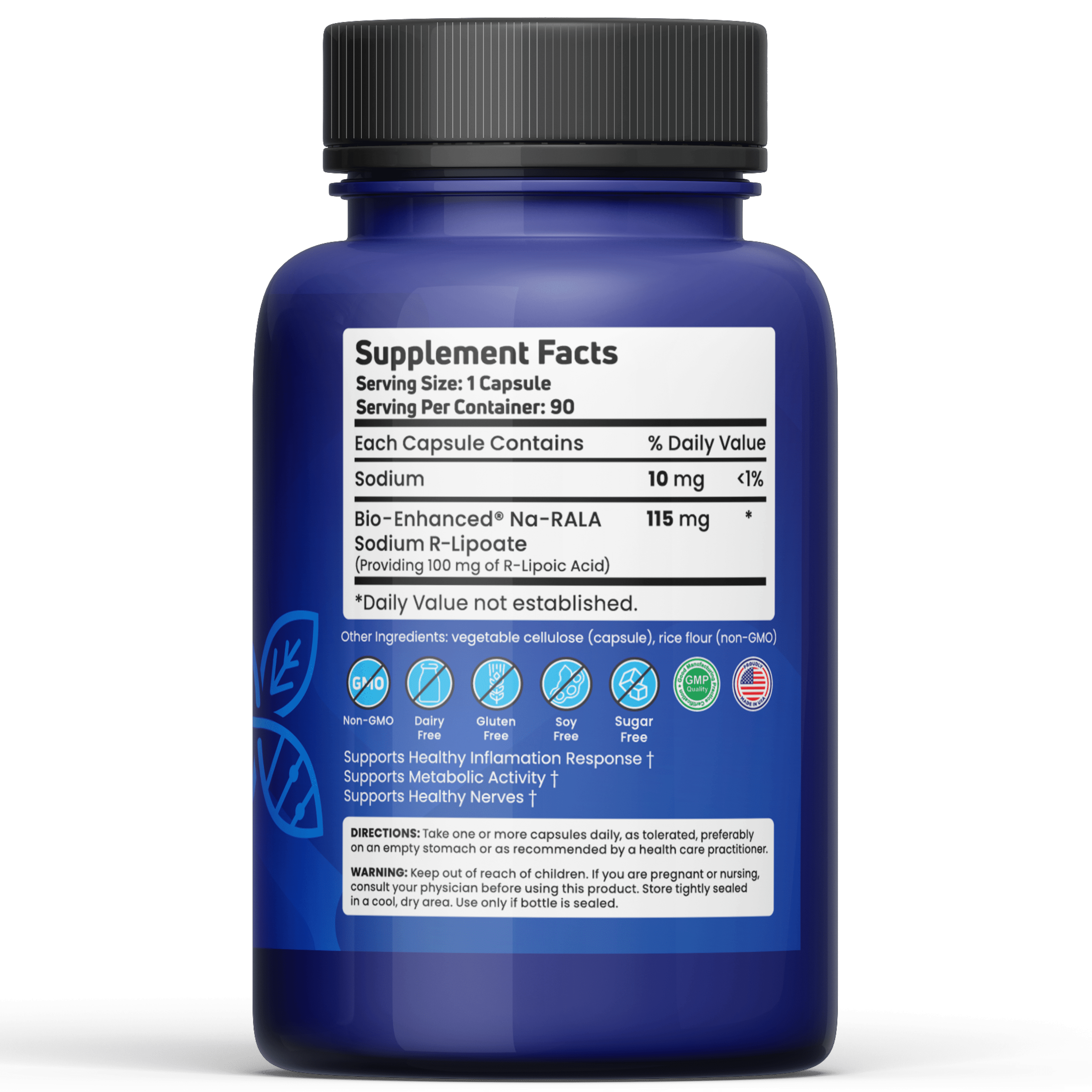 R-Lipoic acid in the form of the sodium salt (Na-RALA) contains less than 1% of the Daily value for sodium, an insignificant contribution to dietary sources. Research suggests that sodium may impact blood pressure in some individuals only when it is consumed as sodium chloride (NaCl, table salt) and not in other forms. The sodium in this product is unlikely to affect blood pressure levels