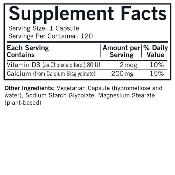 | Calcium (from Calcium Bisglycinate) | 200mg | 15% |