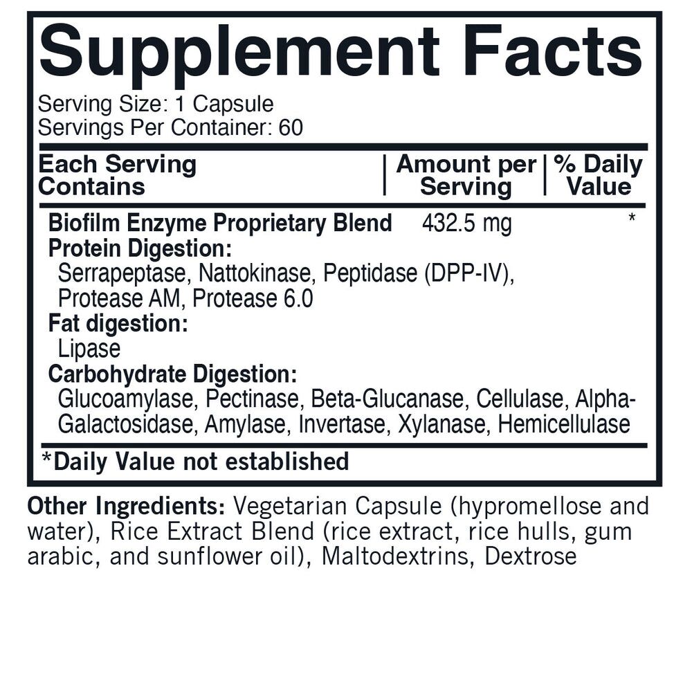 Biofilm Enzyme proprietary blend [Protein Digestion:(Serrapeptase, Nattokinase, Peptidase (DPP-IV), Protease AM, Protease 6.0), Fat digestion: (Lipase), Carbohydrate Digestion: (Glucoamylase, Pectinase, Beta-Glucanase, Cellulase, Alpha- Galactosidase, Amylase, Invertase, Xylanase, Hemicellulase)] | 432.5mg | * |