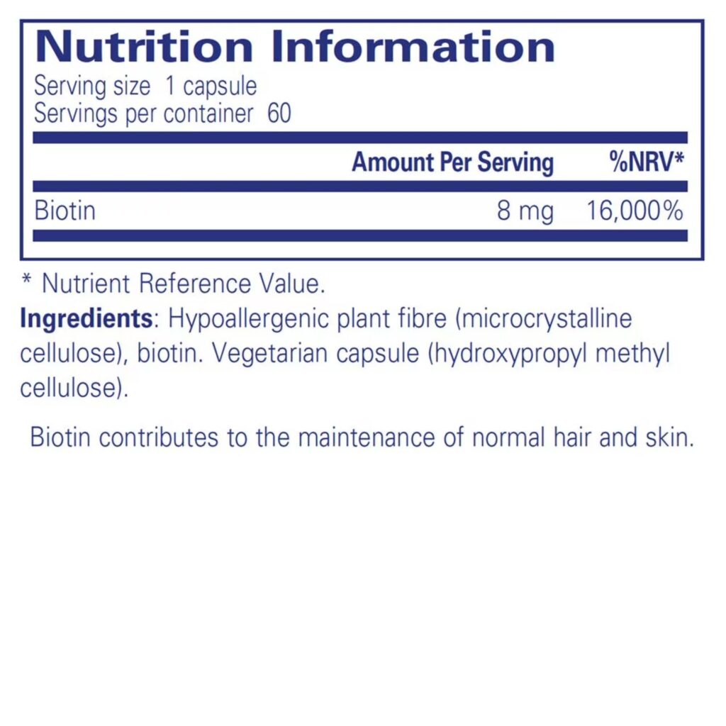 Biotin 8mg provides a water-soluble B-vitamin that supports the maintenance of healthy hair and skin.