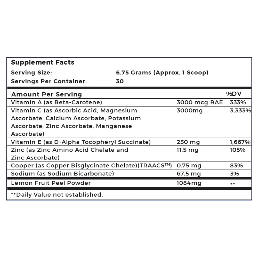 | Vitamin C (as ascorbic acid, magnesium ascorbate, calcium ascorbate, potassium ascorbate, zinc ascorbate, manganese ascorbate) | 3000mg | |