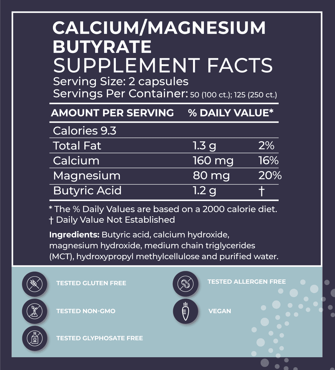 Butyric acid, Calcium hydroxide, Magnesium hydroxide, Medium chain triglycerides (MCT), Hydroxypropyl methylcellulose, Purified water