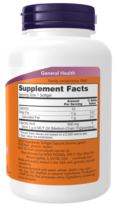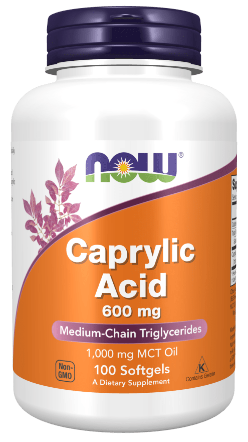 now® Caprylic Acid, also known as octanoic acid, is a naturally derived medium-chain fatty acid (MCT) found in coconut oil and palm kernel oil.