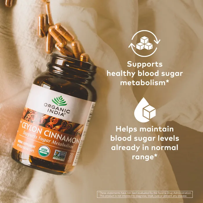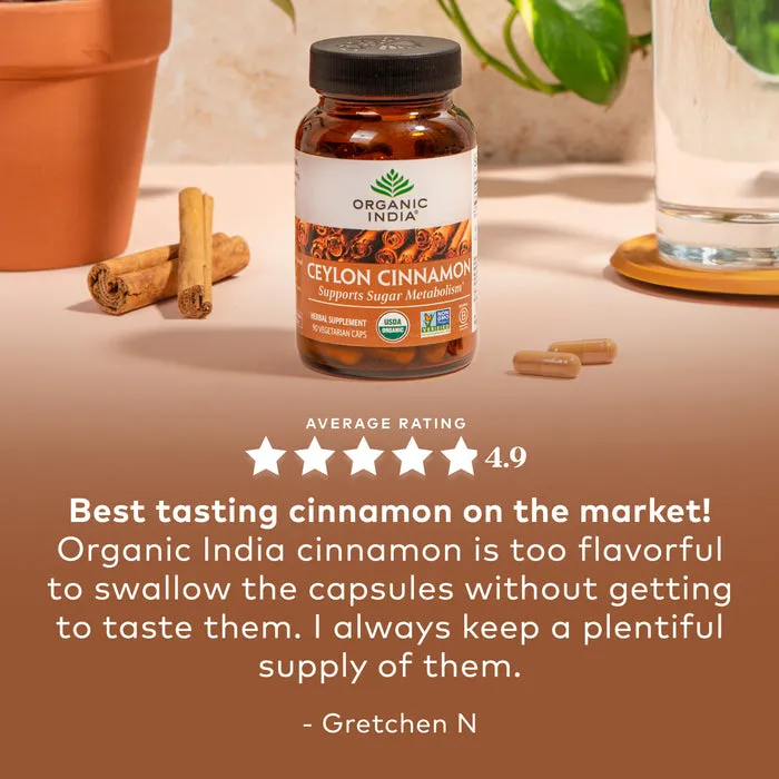 Organic india cinnamon 90 capsules is a natural supplement made from certified organic cinnamon bark, known for its powerful antioxidant and blood sugar supporting properties.