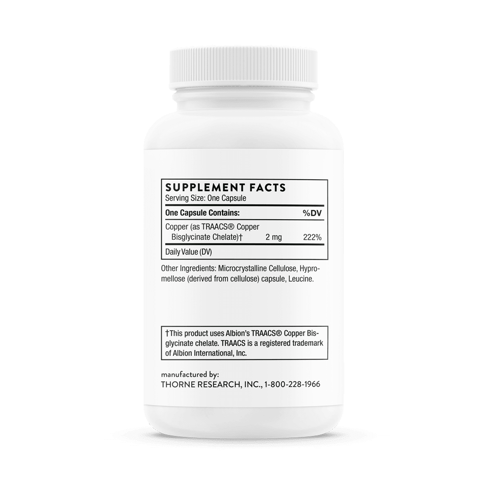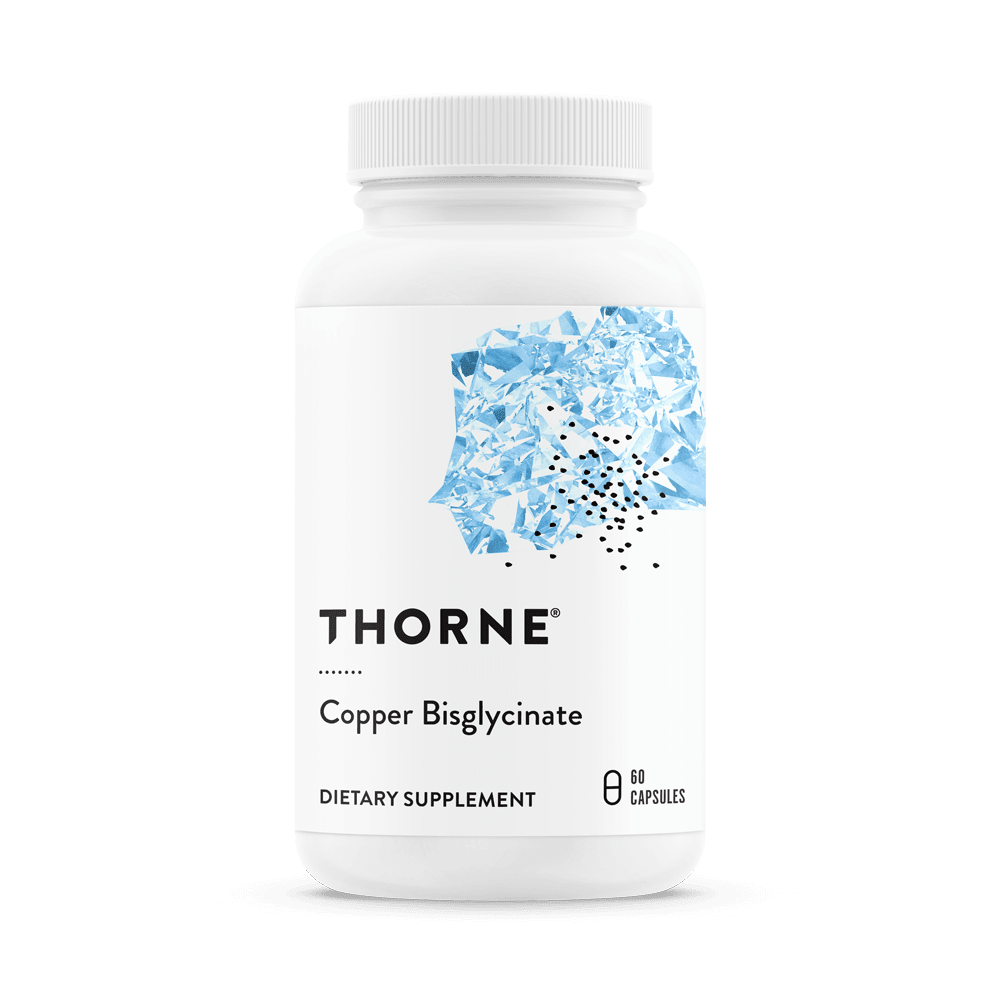 Thorne's Copper Bisglycinate has undergone third-party testing and certification to confirm its contents match the label. This process also ensures the product is free from unsafe levels of contaminants, including heavy metals, pesticides and microorganisms*
