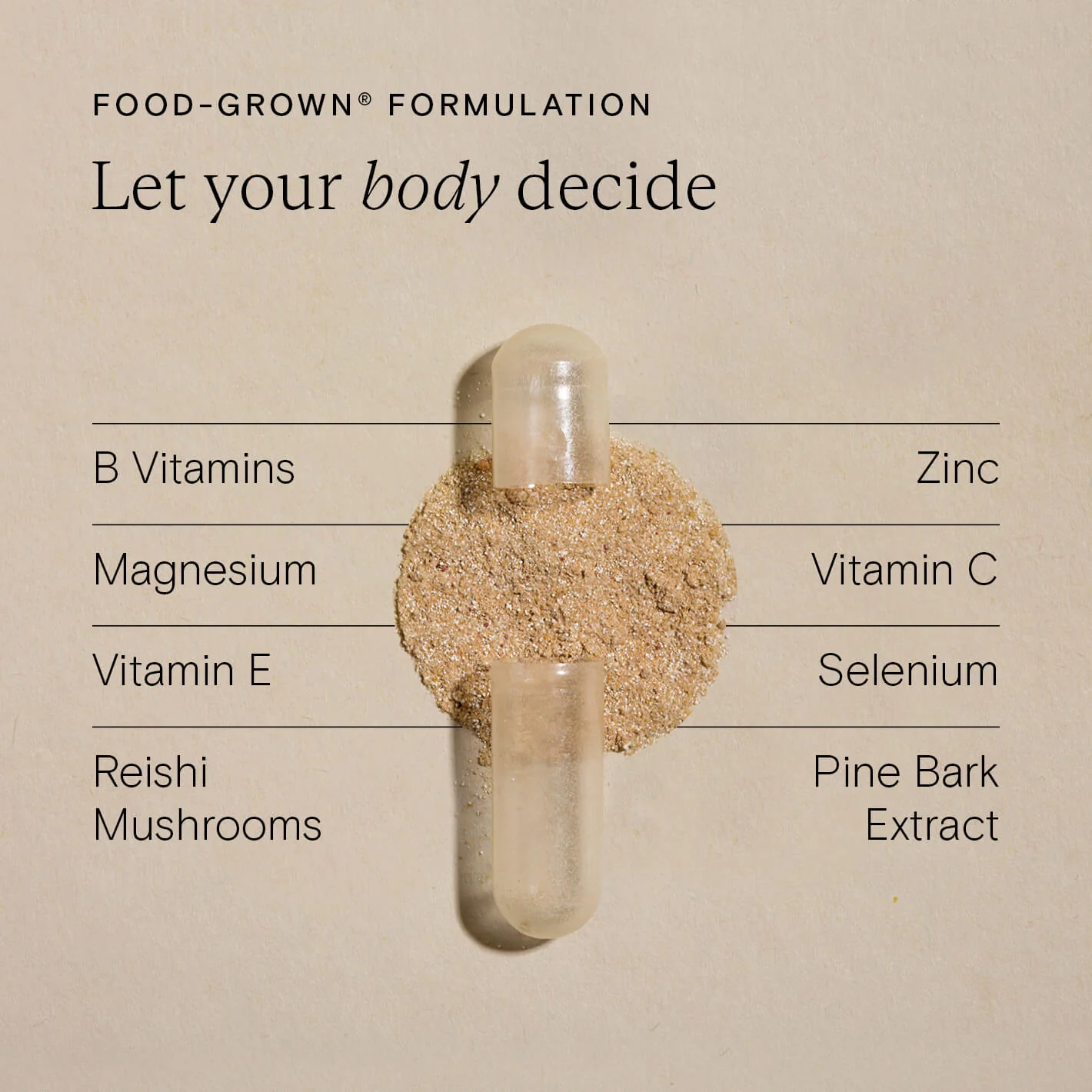 Lithothamnium Calcareum (Red algae) powder (providing Calcium), Vegetable cellulose (Capsule shell), Purified Seawater (providing Magnesium), Nutrient-enhanced Citrus pulp (providing Vitamin C and Bioflavonoids), Nutrient-enhanced Lactobacillus Bulgaricus (providing Zinc, Pantothenic Acid and Copper), Carrot concentrate (providing Beta-carotene), Reishi (Ganoderma lucidum) Mushroom powder, Betaine Hydrochloride, Nutrient-enhanced Yellow Pea (Pisum sativum) preparation (providing Vitamin E), N-Acetyl Cysteine (NAC), Alpha Lipoic acid and Pine bark (Pinus sylvestris) extract.