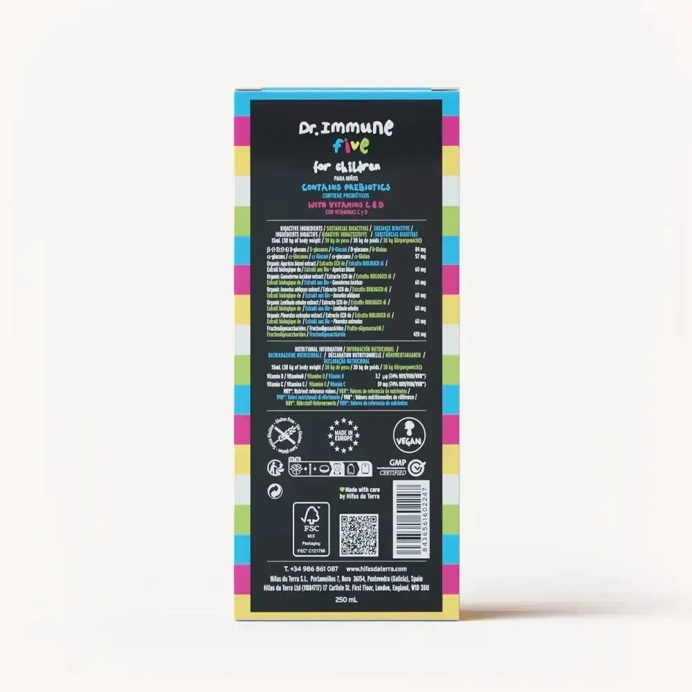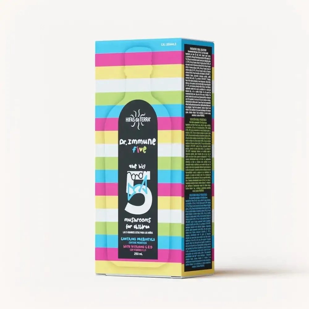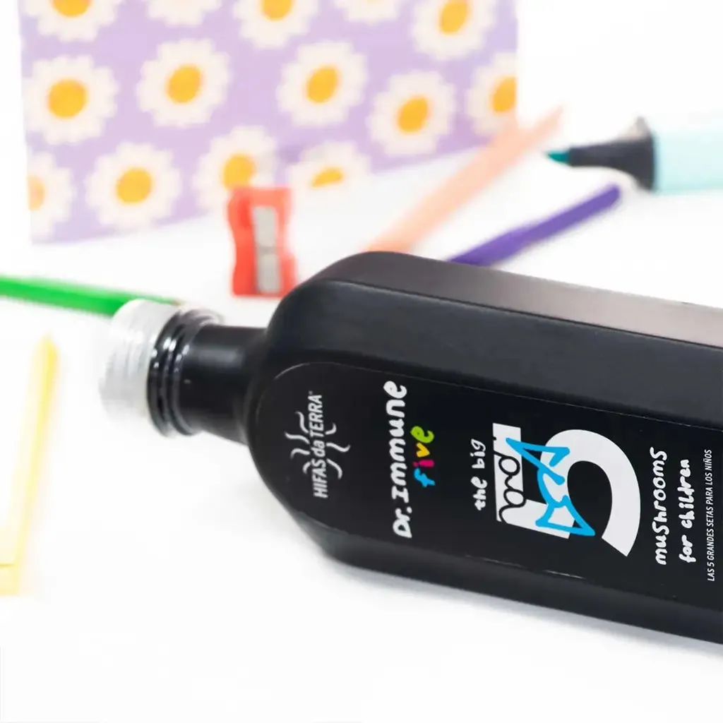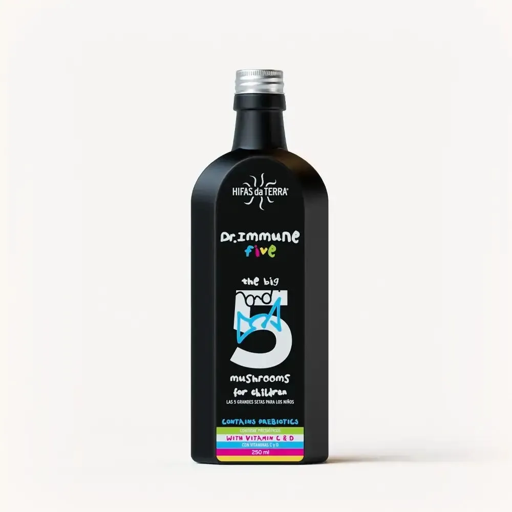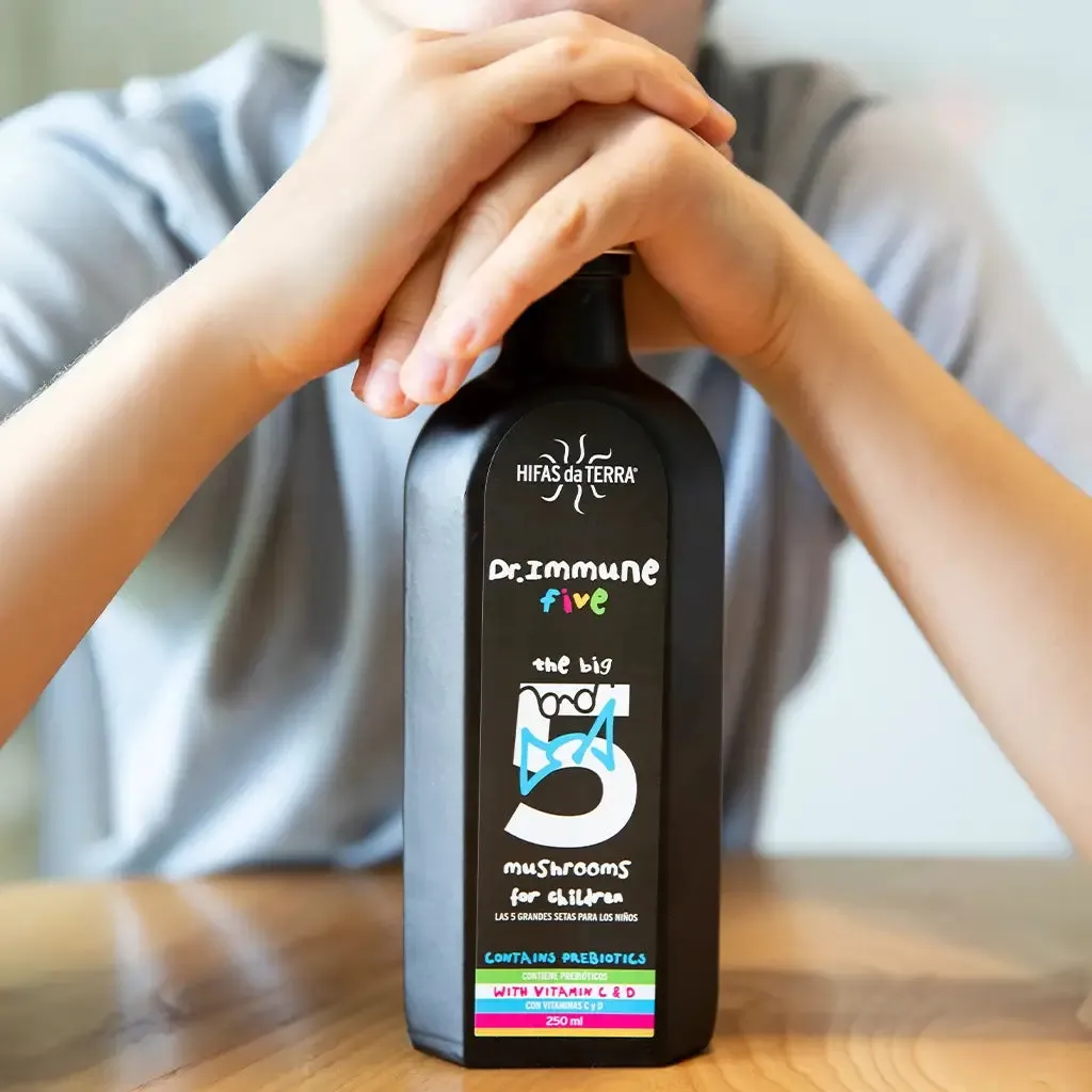 Dr. Immune Five is a liquid dietary supplement for children, formulated with extracts of five powerful mushrooms (Reishi, Maitake, Oyster, Chaga and Shiitake). It contains beta-glucans, prebiotics and vitamins D & C to support immune function