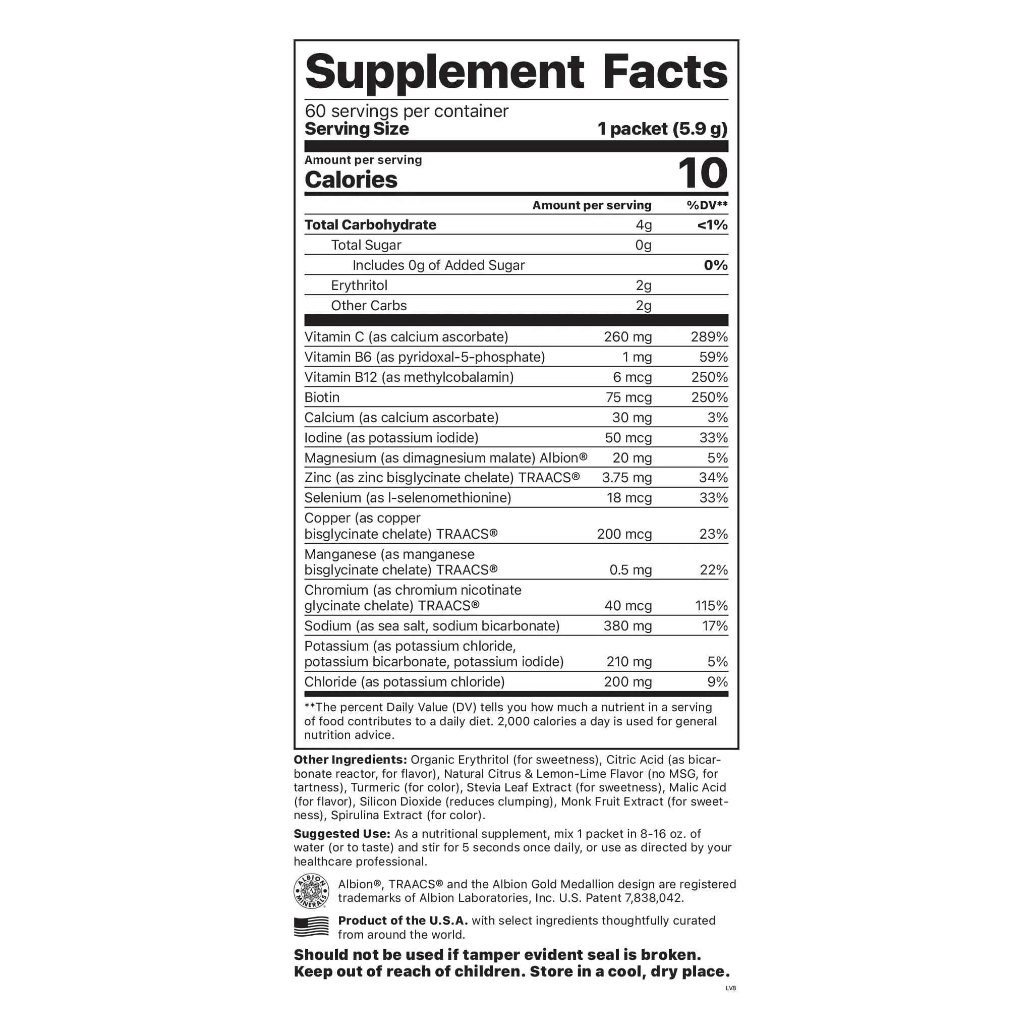 Organic erythritol (for sweetness), Citric acid (as bicar bonate reactor, for flavour), Natural citrus and lemon lime flavour (no MSG, for tartness), Turmeric (for colour), Stevia leaf Extract (for sweetness), Malic acid (for flavour), Silicon dioxide (reduces clumping), Monk fruit extract (for sweet-ness), Spirulina extract (for colour)