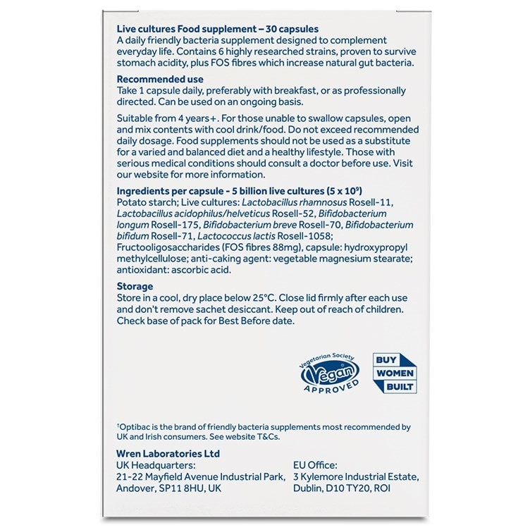 Stabiliser: potato starch; Live cultures: Lactobacillus rhamnosus Rosell-11, Lactobacillus acidophilus/helveticus Rosell-52, Bifidobacterium longum Rosell-175, Bifidobacterium breve Rosell-70, Bifidobacterium bifidum Rosell-71, Lactococcus lactis Rosell-1058; Fructooligosaccharides (FOS 88mg), vegetarian capsule: hydroxypropyl methylcellulose; anti-caking agent: vegetable magnesium stearate; antioxidant: ascorbic acid