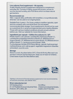 Stabiliser: potato starch; Live cultures: Lactobacillus rhamnosus Rosell-11, Lactobacillus acidophilus/helveticus Rosell-52, Bifidobacterium longum Rosell-175, Bifidobacterium breve Rosell-70, Bifidobacterium bifidum Rosell-71, Lactococcus lactis Rosell-1058; Fructooligosaccharides (FOS 88mg), vegetarian capsule: hydroxypropyl methylcellulose; anti-caking agent: vegetable magnesium stearate; antioxidant: ascorbic acid