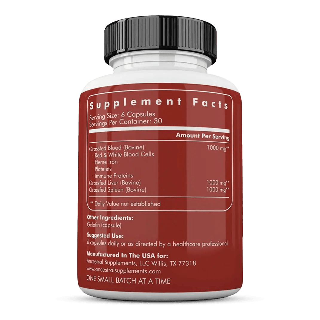 | Grassfed blood [(Bovine), Red and white blood cells, Heme iron, Platelets, Immune protein] | 1000mg | * |