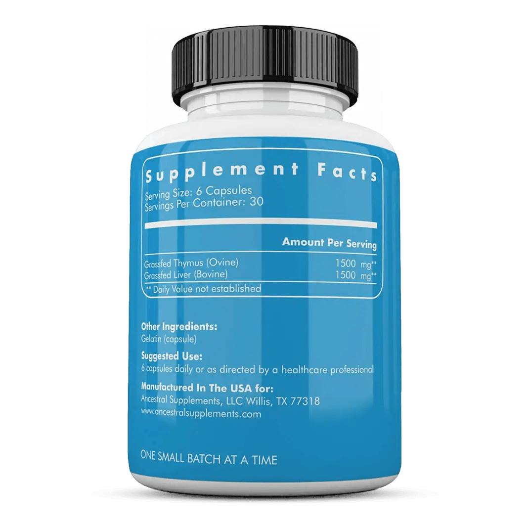 Our thymus supplement includes proteins unique to thymus tissue, along with peptides and hormones like thymosin, thymopoietin and serum thymic factor, which play a key role in regulating immune functions. Inspired by the principle of "like supports like," consuming thymus may help strengthen and support your own thymus gland