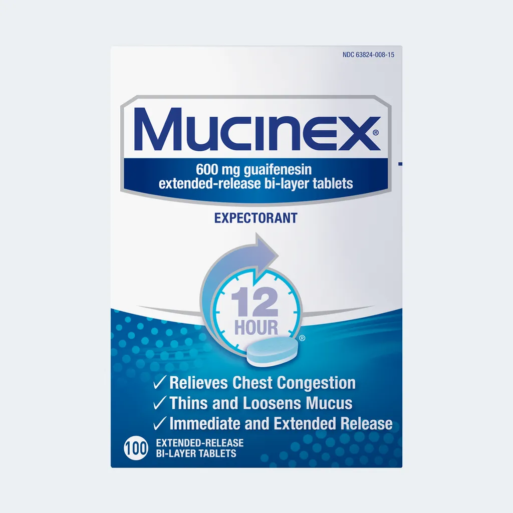 Mucinex® extended-release bi-layer tablets provide 12 hour relief by thinning and loosening mucus, making coughs more productive.