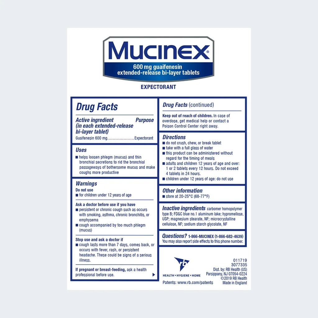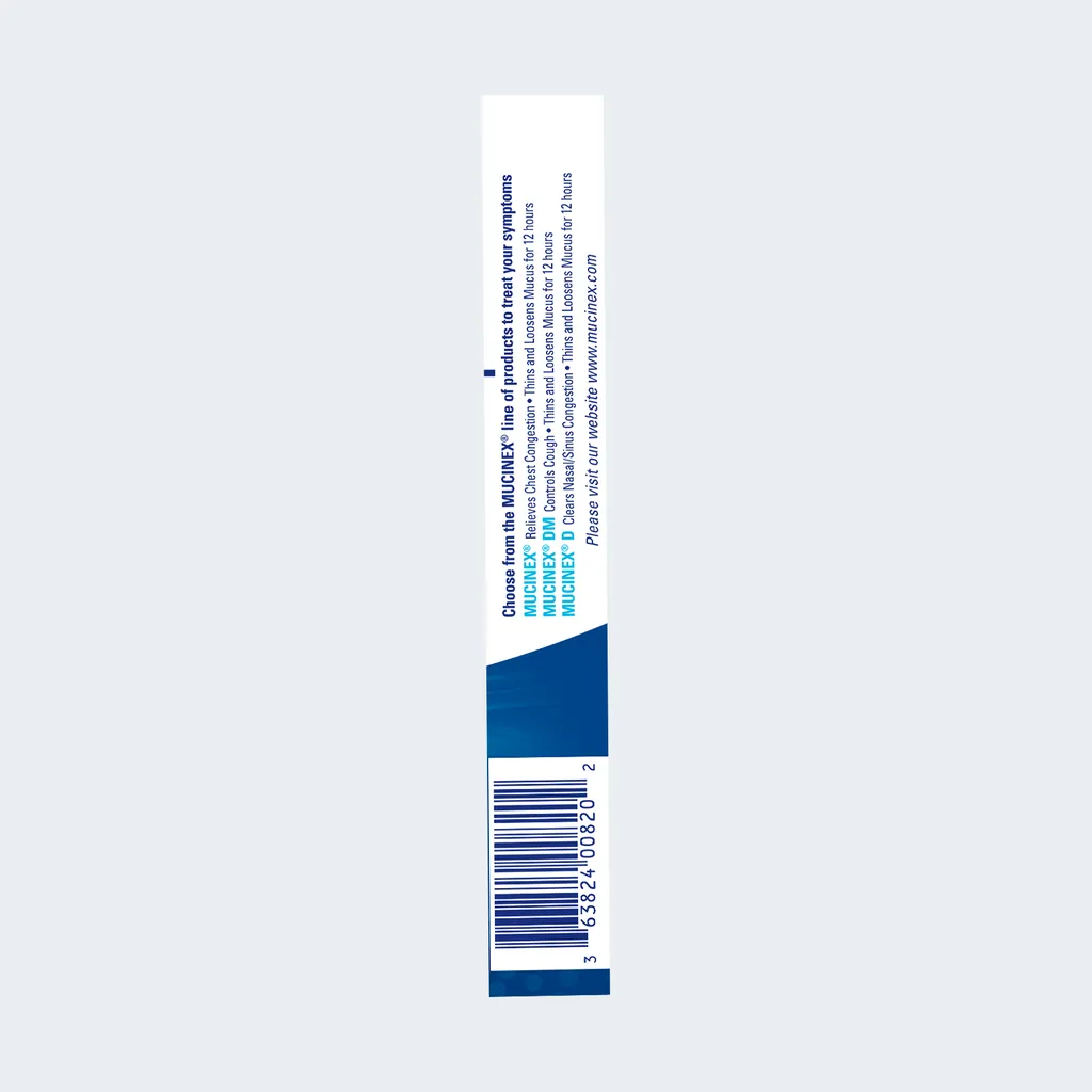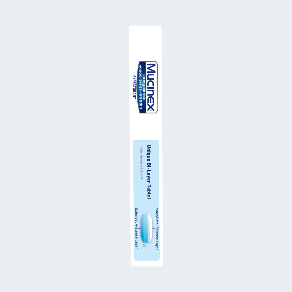 Mucinex® extended-release bi-layer tablets provide 12 hour relief by thinning and loosening mucus, making coughs more productive.