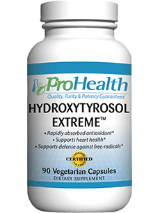 A small molecule rapidly absorbed into the bloodstream and tissues, hydroxytyrosol is also able to cross the blood-brain barrier, supporting systemic defense against free radical damage.* ProHealth's Hydroxytyrosol Extreme™ contains 25mg of hydroxytyrosol per capsule, derived from cultivated organic olive leaf.