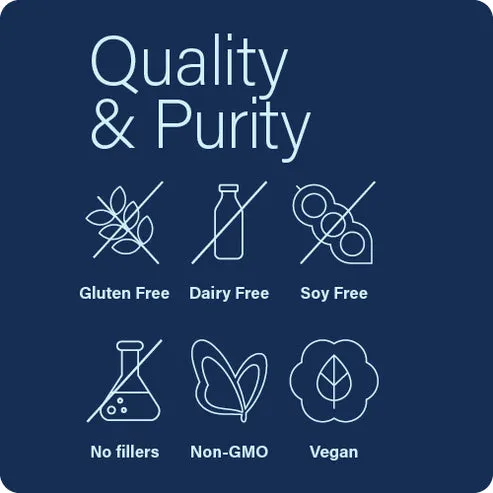 Artificial colours free, Casein Free, Crustaceans free, Egg Free, Fillers free, Fish Free, Gluten Free, Milk Free, Non-GMO, Nuts free, Sesame free, Shellfish Free, Soy Free, Wheat Free