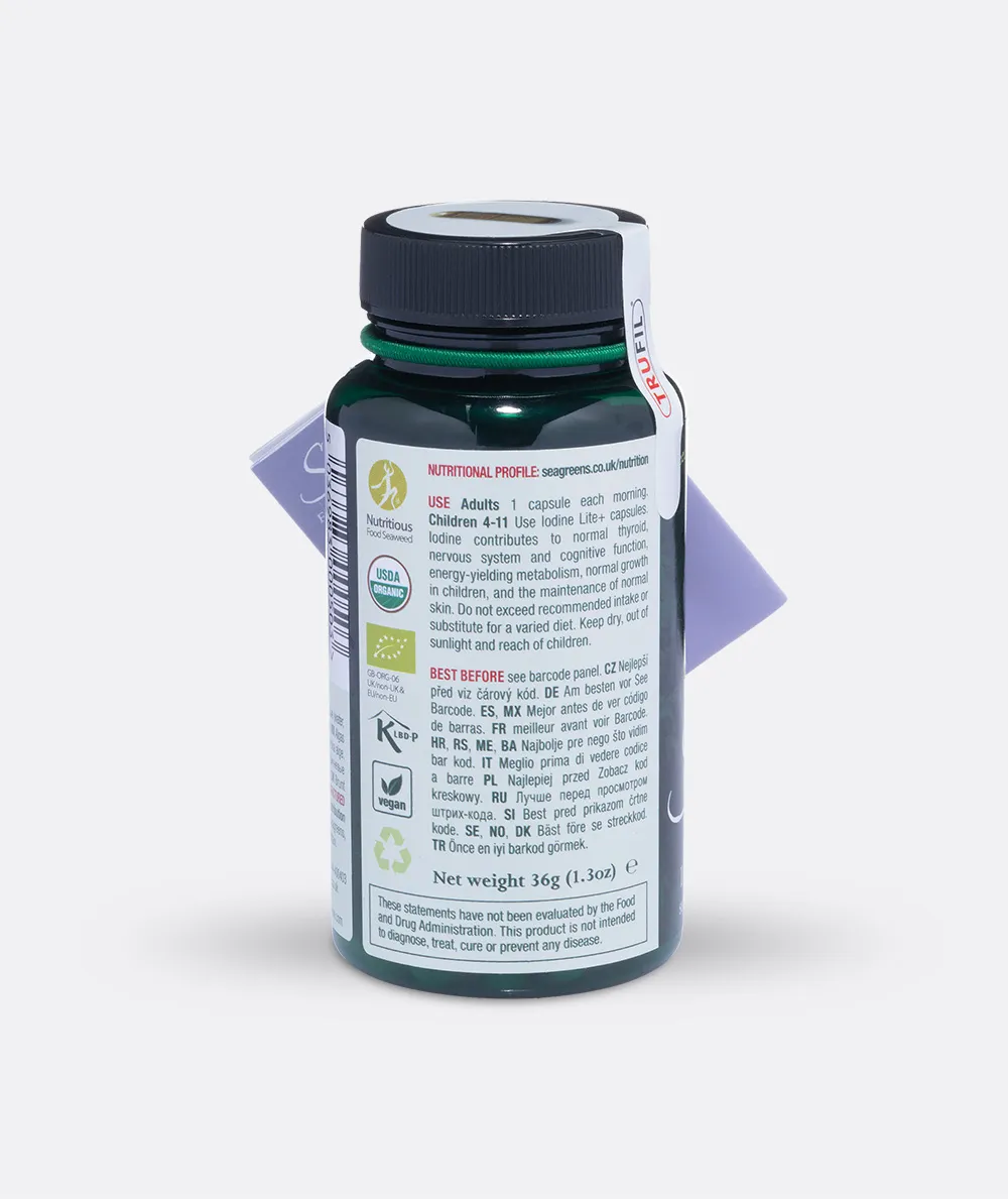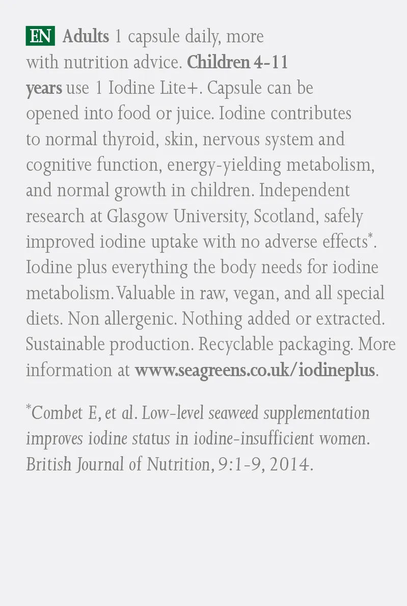 DisclaimerChildren 4-11 Use lodine Lite+ capsules iodine contributes to normal thyroid nervous system and cognitive functio energy-yielding metabolism, normal grow children and the maintenance of formal skin. Do not exceed recommended take or substitute for a varied diet