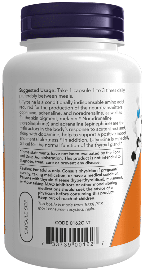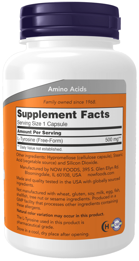 L-Tyrosine is a conditionally essential amino acid important for producing neurotransmitters like dopamine, adrenaline and noradrenaline, as well as the pigment melanin. It supports mood, stress response, mental alertness and thyroid health - How much L-Tyrosine is in each capsule?