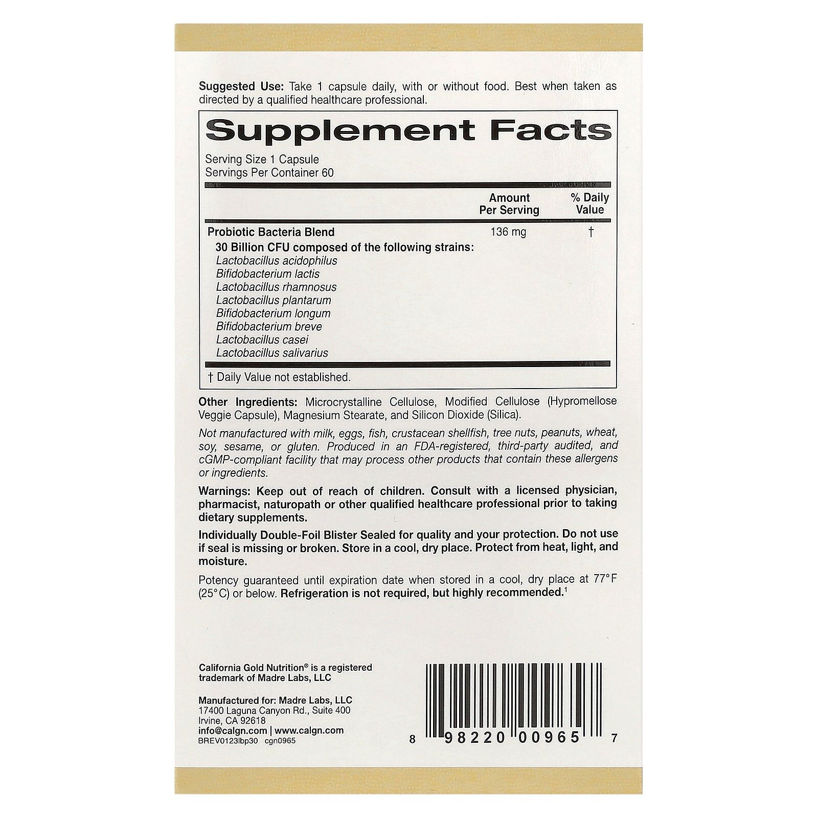 Total cultures (Lactobacillus acidophilus, Bifidobacterium lactis, Lactobacillus rhamnosus, Lactobacillus plantarum, Bifidobacterium longum, Bifidobacterium breve, Lactobacillus casei, Lactobacillus salivarius) | 30 Billion CFU | |