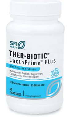 Ther-Biotic® LactoPrime™ Plus is a broad-spectrum probiotic featuring a 12-strain blend of 7 Lactobacillus and 5 Bifidobacterium species, designed to support digestive and immune health.† It comes in a purified plant cellulose base and is free from inulin and other prebiotic fibers, making it suitable for those on restrictive diets like a low-FODMAP diet