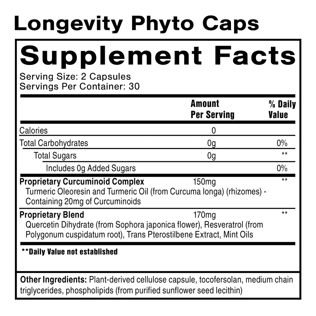 Longevity phyto caps 60 capsule is a potent blend of plant based antioxidants and polyphenols designed to support healthy aging, cellular resilience and overall vitality.