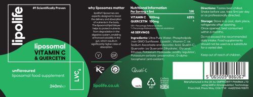 Ultra-Pure Water, Phospholipids (non GMO Sunflower, Lipoid®), Vitamin C (as Sodium Ascorbate and Ascorbic Acid, Quali®-C), Quercetin (as Quercetin Dihydrate), Glycerol, Potassium Hydroxide (acidity regulator), Ethanol, Potassium Sorbate (preservative), Mixed Tocopherols (antioxidant).