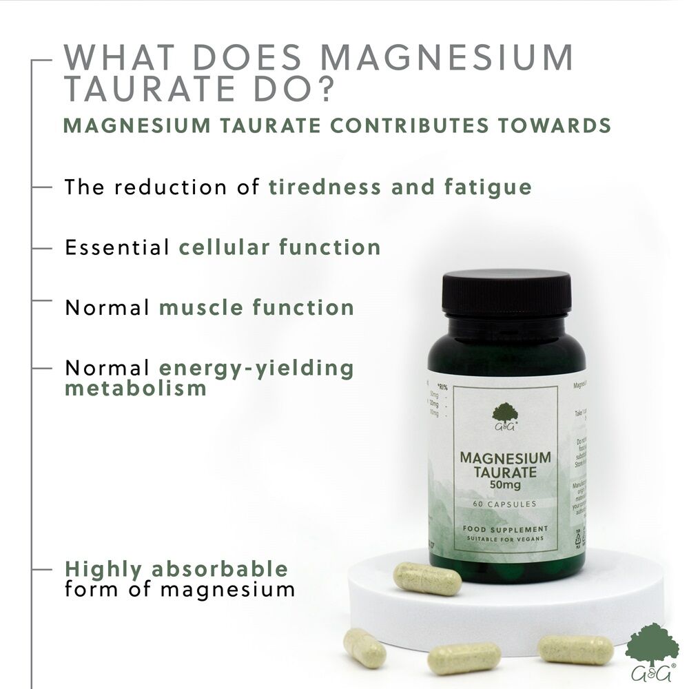 This magnesium taurate supplement is a highly absorbed form of magnesium delivers 50mg of elemental magnesium in each vegan capsule. The use of magnesium taurate in this formulation enhances absorption as it is combined with the amino acid taurine, making it easier for the body to utilize