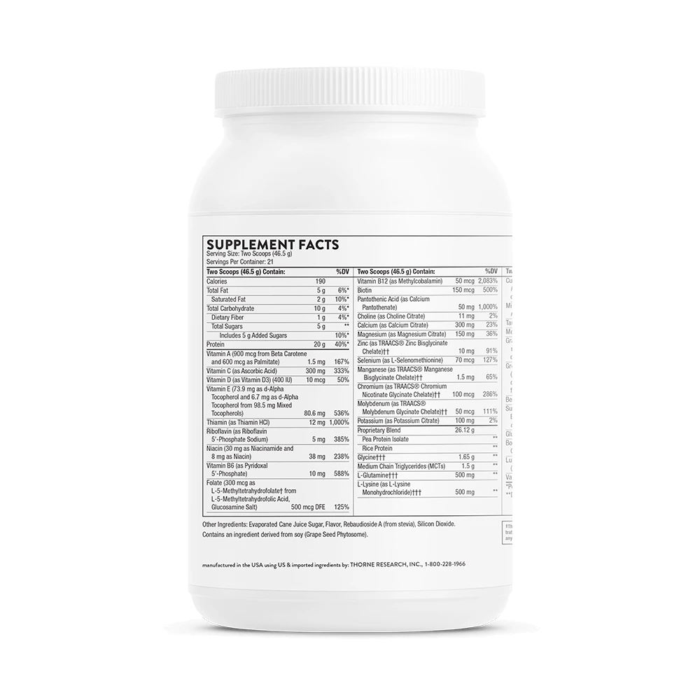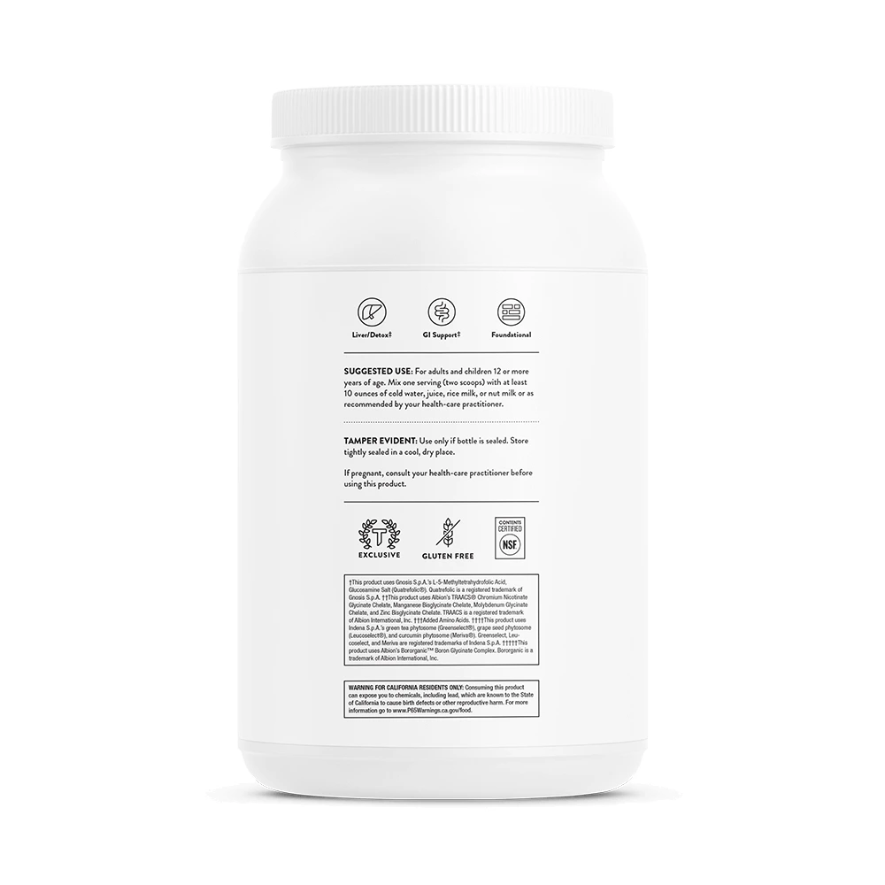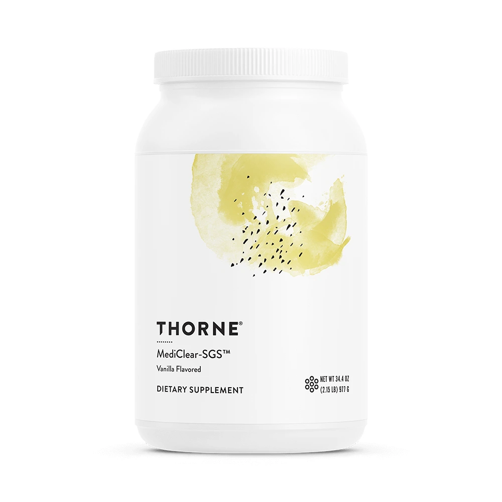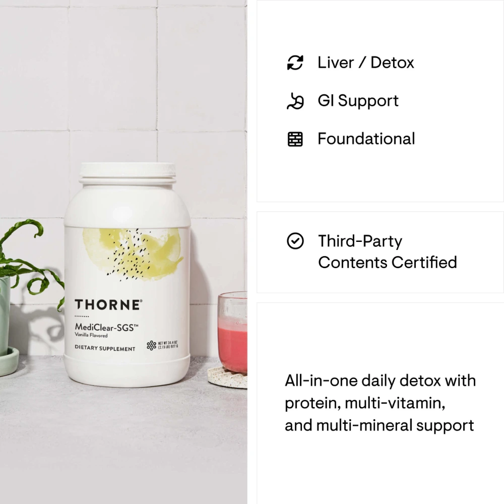 Thorne’s MediClear-SGS offers comprehensive daily nutrition by combining two plant-based proteins with a complete multivitamin and multimineral complex, antioxidants, broccoli seed extract and liver-supporting botanicals, making it ideal for combating the challenges of a toxic environment
