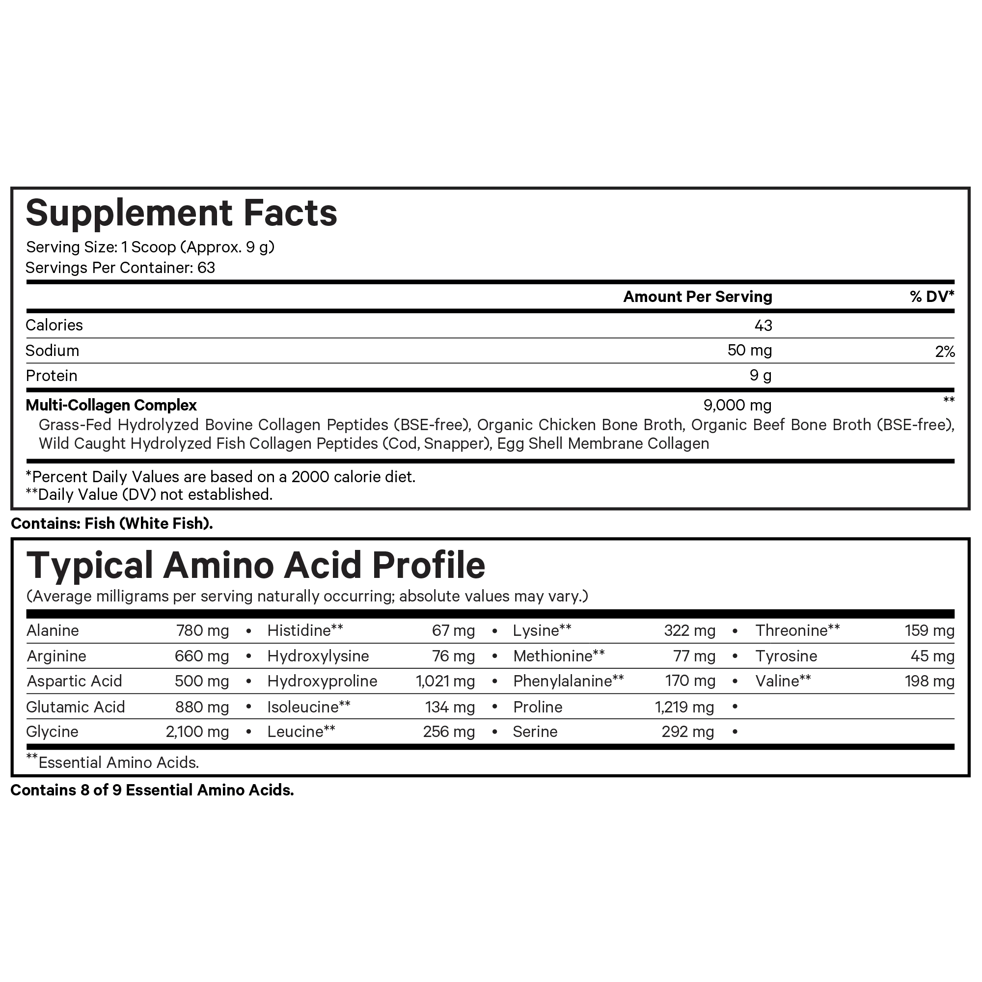 Multi-Collagen Complex (Grass-Fed Hydrolyzed Bovine Collagen Peptides (BSE-free) organic Chicken Bone Broth organic Beef Bone Broth (BSE-free), Wild Caught Hydrolyzed Fish Collagen Peptides (Cod, Snapper), Egg Shell Membrane Collagen) | 9000mg | |