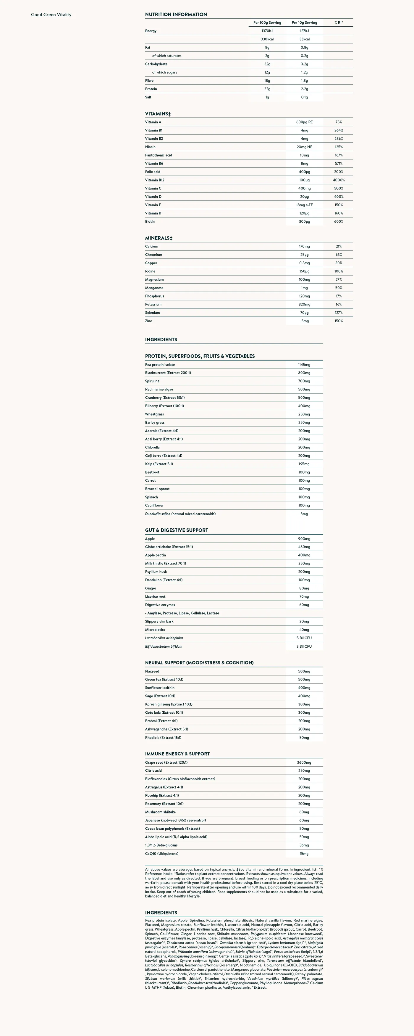 Pea protein isolate, Apple, Spirulina, Potassium phosphate dibasic, Natural vanilla flavour, Red marine algae, Flaxseed, Magnesium citrate, Sunflower lecithin, L-ascorbic acid, Natural pineapple flavour, Citric acid, Barley, grass, Wheatgrass, Apple pectin, Psyllium husk, Chlorella, Citrus bioflavonoids', Broccoli sprout, Carrot, Beetroot, Spinach, Cauliflower, Ginger, Licorice root, Shiitake mushroom, Polygonum cuspidatum (apanese knotweed), Digestive enzymes (amylase, protease, lipase, cellulase, lactase), R, S alpha-lipoic acid, Astragalus membranaceus, (astragalus)", Theobroma cacao (cacao bean)", Camellia sinensis (green tea)", Lycium borbarum (goj", Malpighia, punicifolia (acerola)", Rosa canina (rosehip), Bacopa monnieri (brahmi', Euterpe oleracea (acai) Zinc citrate, Mixed, natural tocopherols, Withania somifera (ashwagandha’, Salvia officinalis (sage)", Fucus vesiculosus (kelp, 1,3/1,6, Beta-glucans, Panax ginseng (Korean ginseng)’, Centellaasiatica Gotu kola)" Vitis vinifera grape seed)’, Sweetener, Gsteviol glycosides), Cynara scalymus (globe artichoke)’, Slippery elm, Taraxacum officinale (dandelion)’, Lactobacillus acidophilus, Rosmarinus officinalis (rosemary)’, Nicotinamide, Ubiquinone (CoQI0), Bifidobacterium, bifidum, L-selenomethionine, Calcium d-pantothenate, Manganese gluconate, Vaccinium macrocarpon (cranberry)*, Pyridoxine hydrochloride, Vegan cholecalciferol, Dundliella salina (mixed natura carotenoids), Retiny! palmitate, Silybum marionum (milk thistle)’, Thiamine hydrochloride, Vaccinium myrtillus (bilberry)’, Ribes nigrum, (blackcurrant)", Riboflavin, Rhodiolarosea (rhodiola)", Copper gluconate, Phylloquinone, Menaquinane-7, Calcium, L-5-MTHF (Folate), Biotin, Chromium picolinate, Methylcobalamin.
