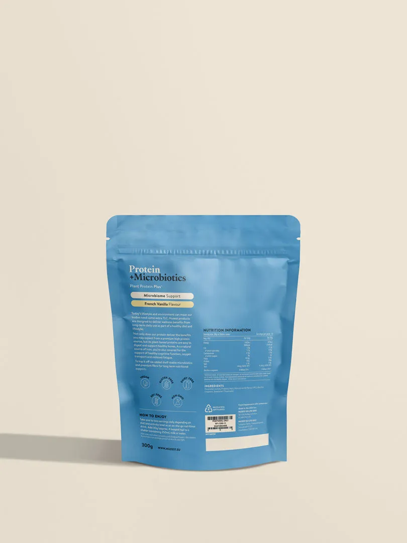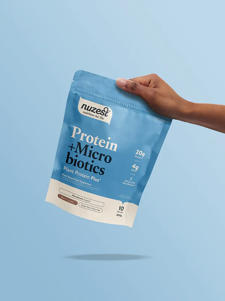 Protein + Microbiotics combines 20g of plant-based protein with Bacillus coagulans for digestive support and prebiotic fibre to nourish gut flora