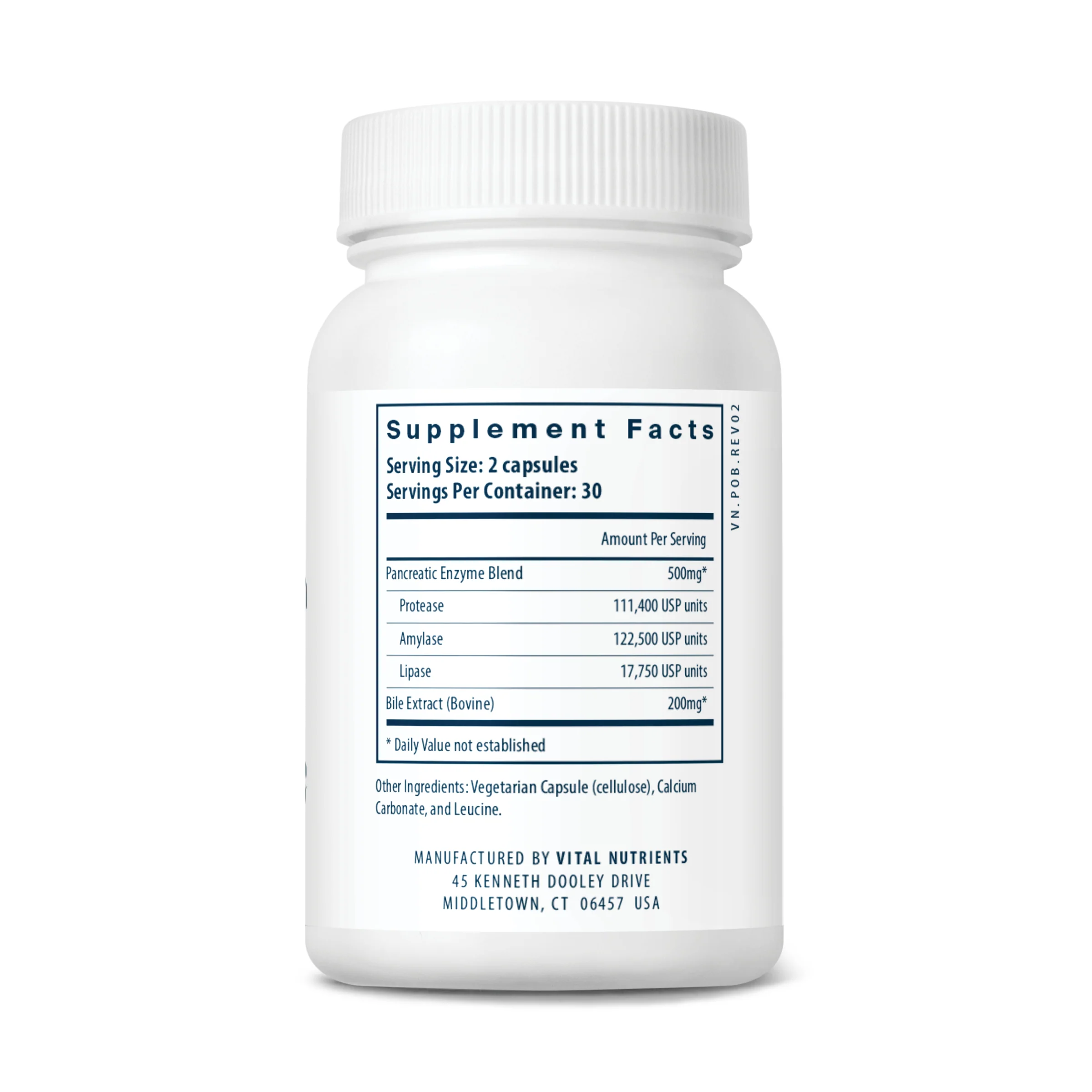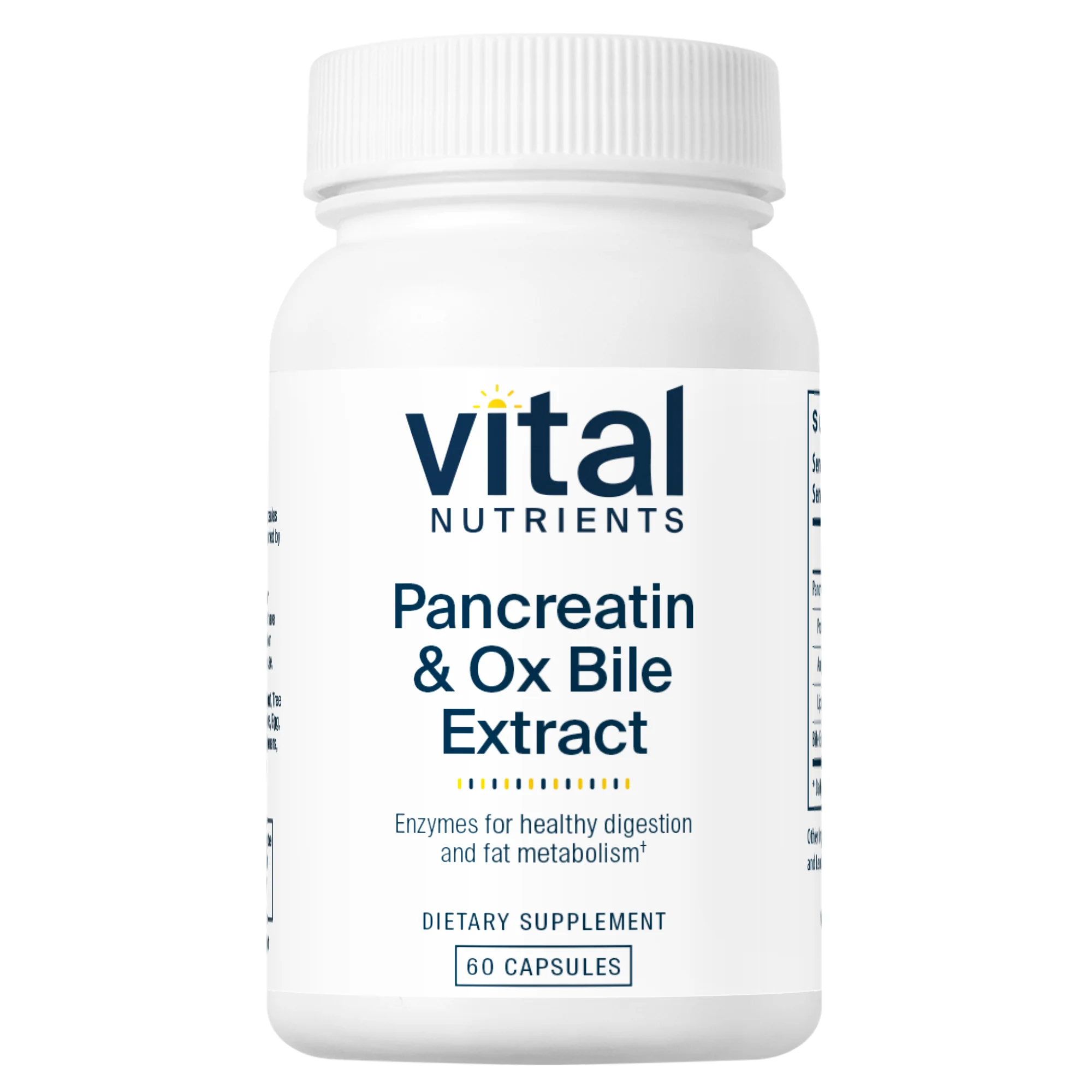 Pancreatin & Ox Bile support healthy digestion by providing key enzymes such as lipase, protease and amylase, which are naturally produced by the pancreas and small intestine to break down fats, peptides and starches.
