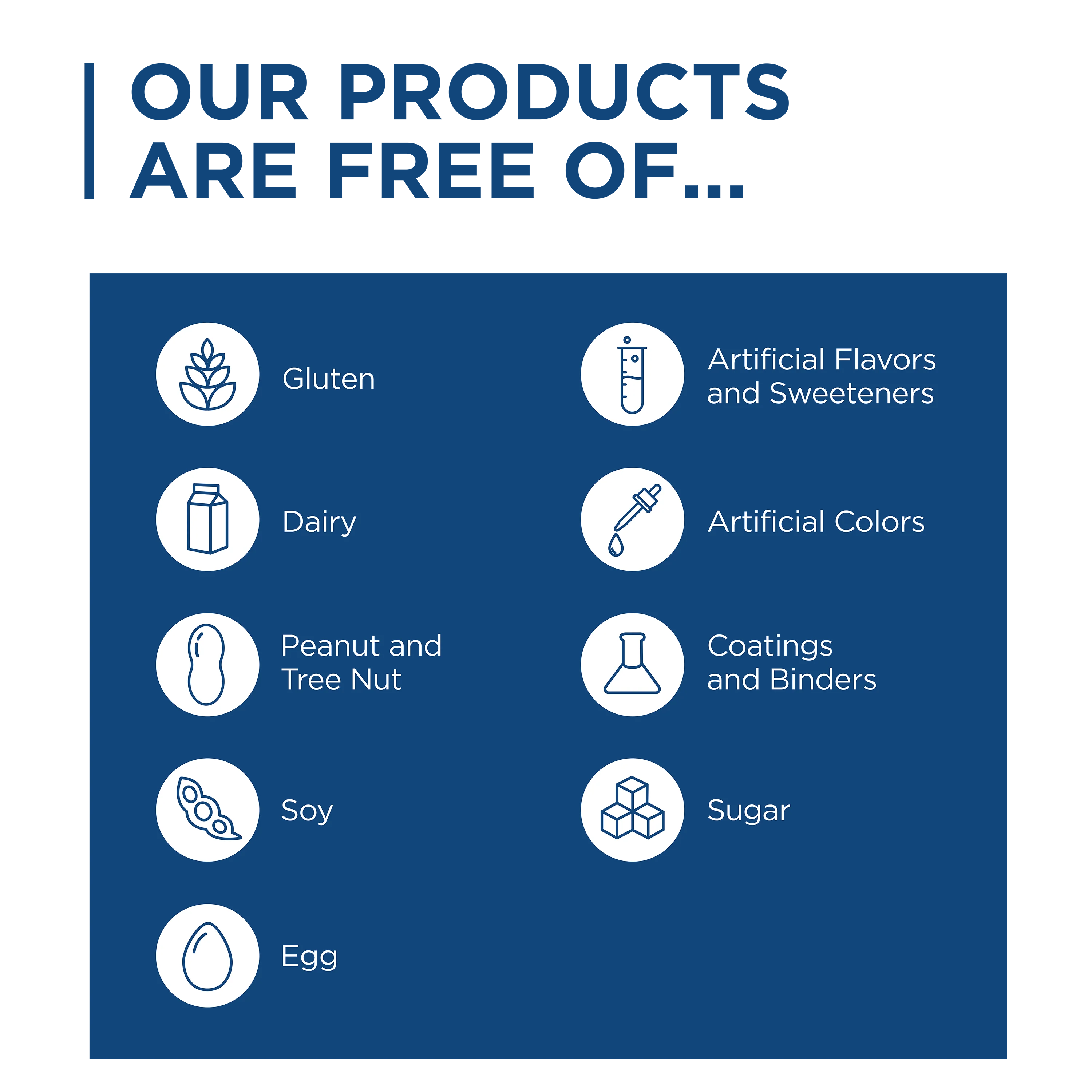 Artificial colours free, Artificial flavours free, Artificial sugar free, Dairy Free, Egg Free, Fish Free, Gluten Free, Non-GMO, Peanuts free, Seasame free, Shellfish Free, Soy Free, Tree nuts free, Unnecessary excipients free