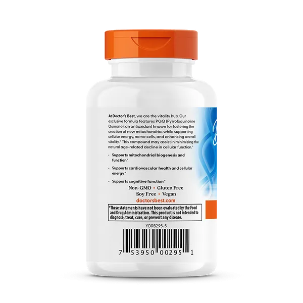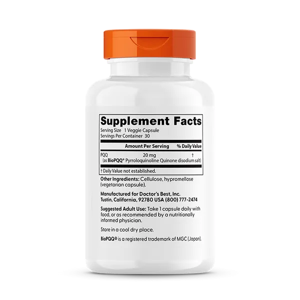 Each capsule contains 20mg of BioPQQ® (Pyrroloquinoline Quinone disodium salt) and is made with cellulose and hypromellose (vegetarian capsule)