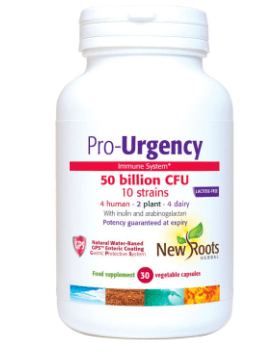 What is New Roots Pro‑Urgency and what does it do? - New Roots Pro‑Urgency is a high‑potency probiotic supplement formulated to deliver at least 50 billion live probiotic cells per capsule from a blend of 10 clinically supported strains of beneficial bacteria. It supports healthy intestinal flora balance and digestive health, and may help with acute infectious or antibiotic‑associated diarrhea and other digestive disruptions. The enteric‑coated capsules are designed to protect the probiotics from stomach acid so they survive to reach the intestines where they’re most effective. How should Pro‑Urgency be taken for best results? - The general suggested use is 1–2 capsules per day with water or juice, or as directed by a health‑care practitioner. If taking antibiotics, it’s often recommended to space the probiotic at least 2–3 hours before or after antibiotic doses to help preserve probiotic effectiveness. Always check specific label directions and consult a practitioner if unsure. What are the key ingredients and why are they important? - Each capsule contains a diverse probiotic blend (50 billion CFU) made up of Bifidobacterium and Lactobacillus strains that support gut health. It also includes prebiotic fibres like fructooligosaccharides (FOS) and arabinogalactan to nourish the probiotic bacteria and help them establish in the gut. The enteric coating (GPS™/PH⁵D) helps the probiotics survive stomach acid so they reach the intestines. This combination supports a balanced gut microbiome and may also contribute to immune health.
