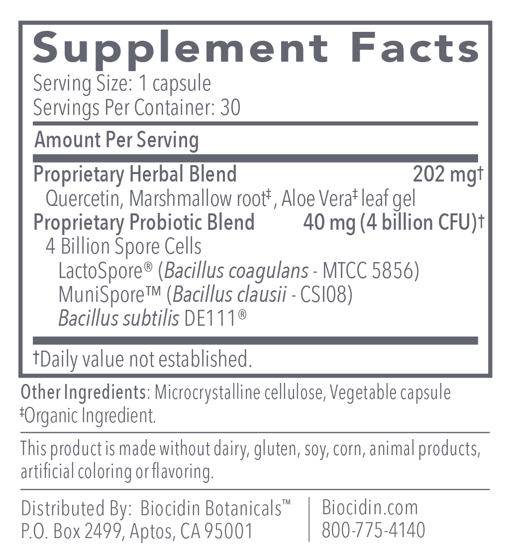 | Proprietary herbal blend (quercetin, marshmallow root‡ , aloe vera‡ leaf gel) | 202mg | |