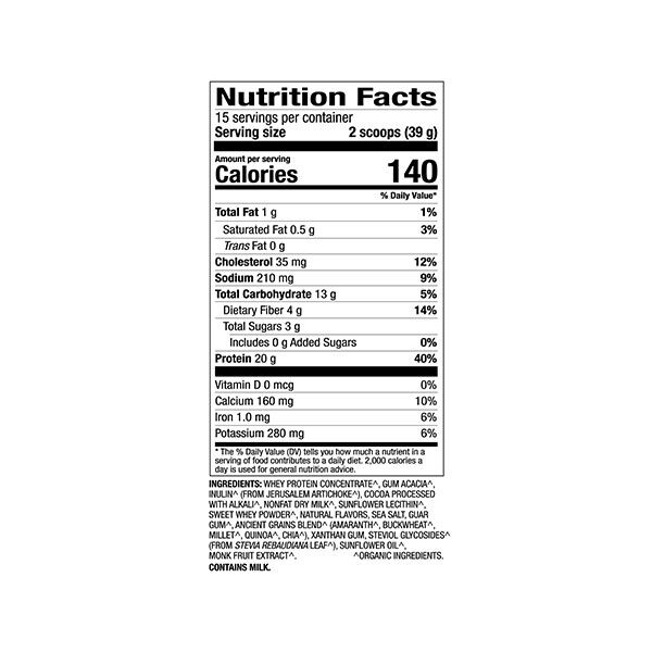Whey protein concentrate, Gum acacia, Inulin from Jerusalem artichoke, Nonfat dry milk, Sweet whey powder, Sunflower lecithin, Natural flavours, Sea salt, Guar gum, Ancient grains blend (Amaranth, Buckwheat, Millet, Quinoa, Chia), Xanthan gum, Steviol glycosides from Stevia rebaudiana leaf, Sunflower oil, Monk fruit extract