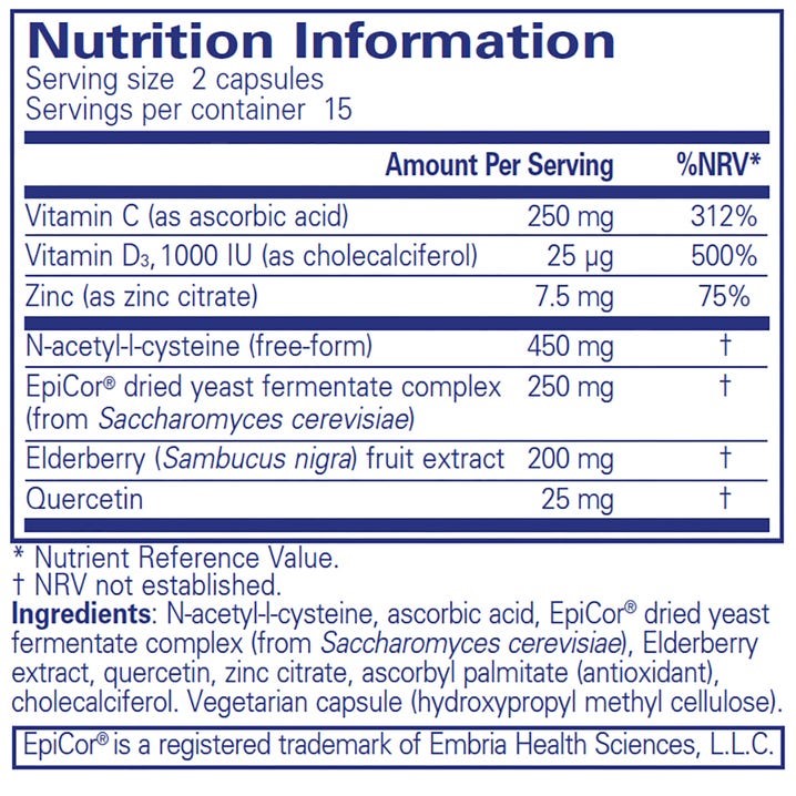 The formula also includes N-acetylcysteine (NAC), quercetin, elderberry extract, and EpiCor®, a unique fermentate that supports immune cell activity and antioxidant defenses.