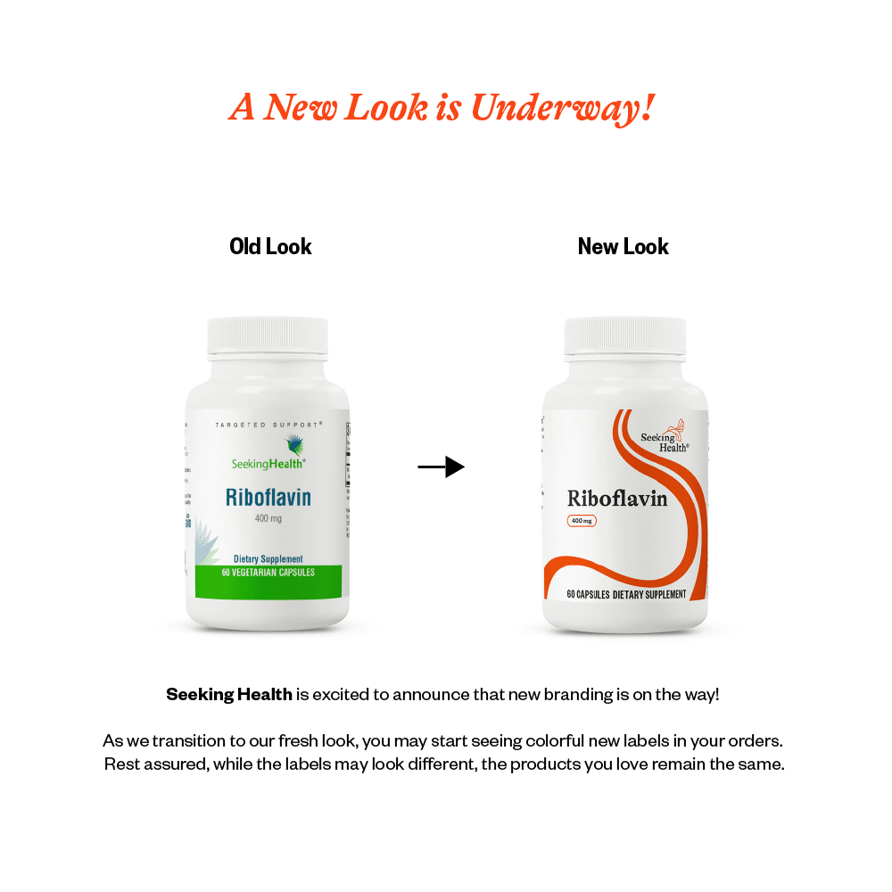 Seeking Health's Riboflavin supplement delivers a potent 400mg of riboflavin per vegan-friendly capsule. It features vitamin B2 in its active and highly bioavailable form as riboflavin-5-phosphate (R-5-P)*. Riboflavin 5’-Phosphate (R-5-P) is the active form of riboflavin (vitamin B2). This form is more easily absorbed and exhibits higher biological activity in the body compared to regular riboflavin supplements. Our formula combines both riboflavin and R-5-P, offering enhanced support for those who may have difficulty converting riboflavin into its active form*