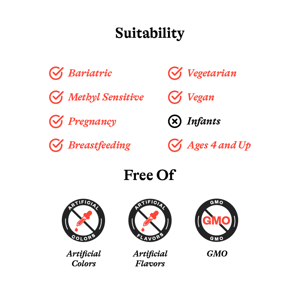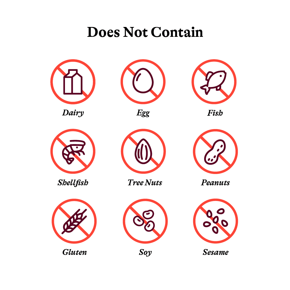 Artificial colours free, Artificial flavours free, Dairy Free, Egg Free, Fish Free, Gluten Free, Non-GMO, Peanuts free, Seasame free, Shellfish Free, Soy Free, Tree nuts free