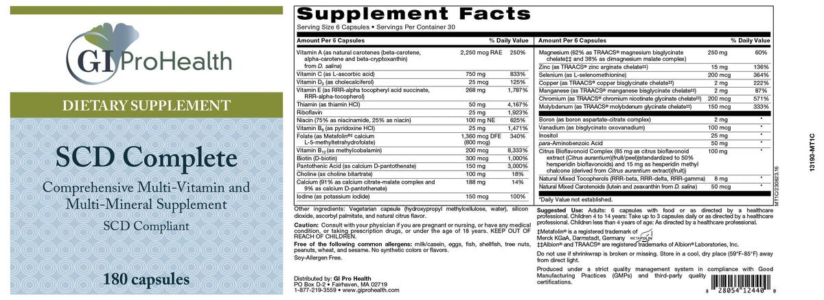SCD Complete™ Capsule Formula is a high-potency multi-vitamin and multi-mineral supplement that contains a comprehensive range of vitamins, minerals, trace elements, antioxidants, and natural carotenoids. It is specifically designed to provide essential micronutrients for overall health and is compliant with the Specific Carbohydrate Diet (SCD) - What nutrients are included in SCD Complete™ Capsule Formula?