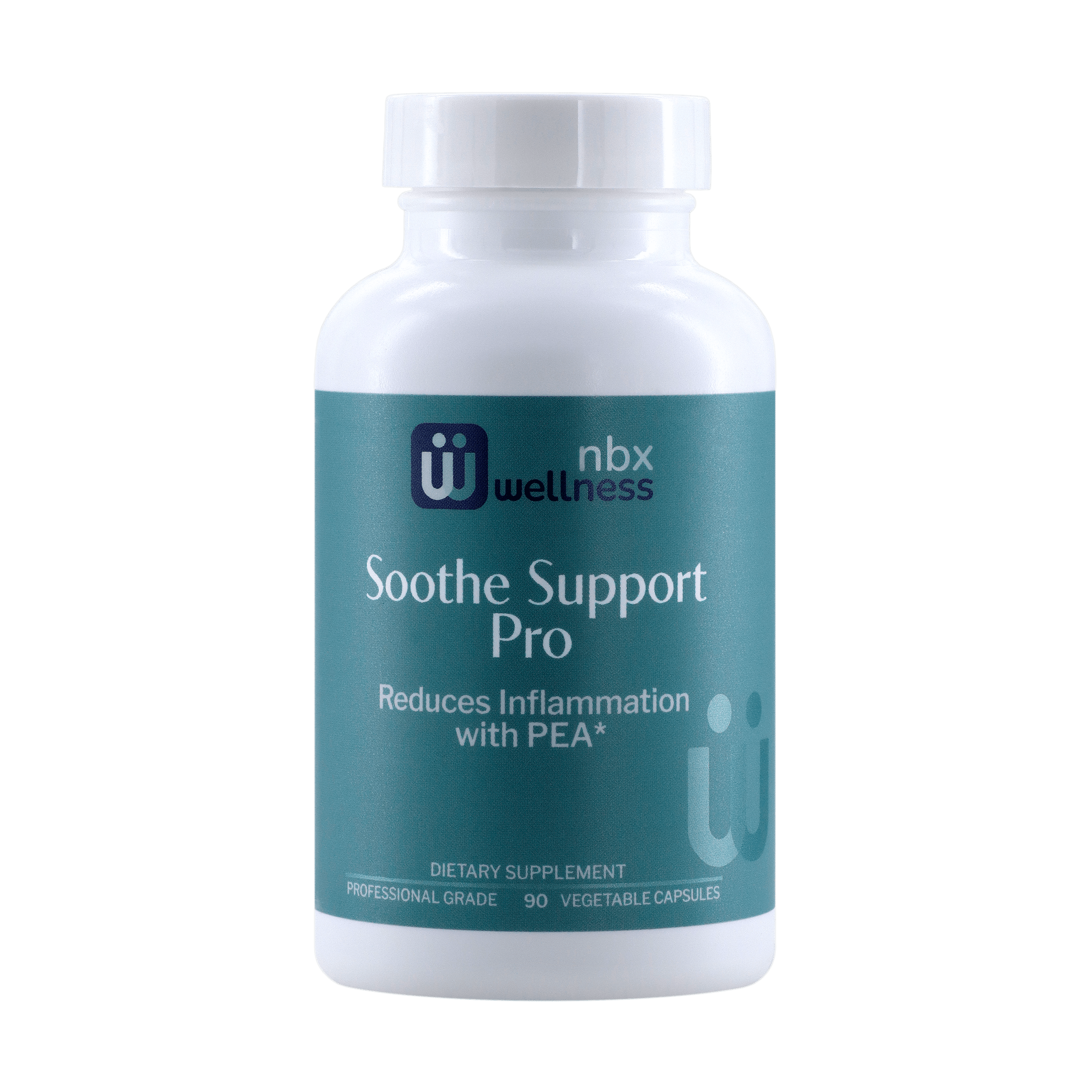 Soothe Support Pro, featuring palmitoylethanolamide (PEA), reduces inflammation naturally. PEA is a bio identical compound produced by healthy tissue to respond to inflammation, offering anti inflammatory, neuroprotective and pain relieving effects. It supports the nervous system and normalizes immune responses without the psychoactive effects of opioids. By enhancing CB2 receptor sensitivity and stabilizing microglial and mast cell function, PEA helps manage inflammation and pain while promoting overall cellular health