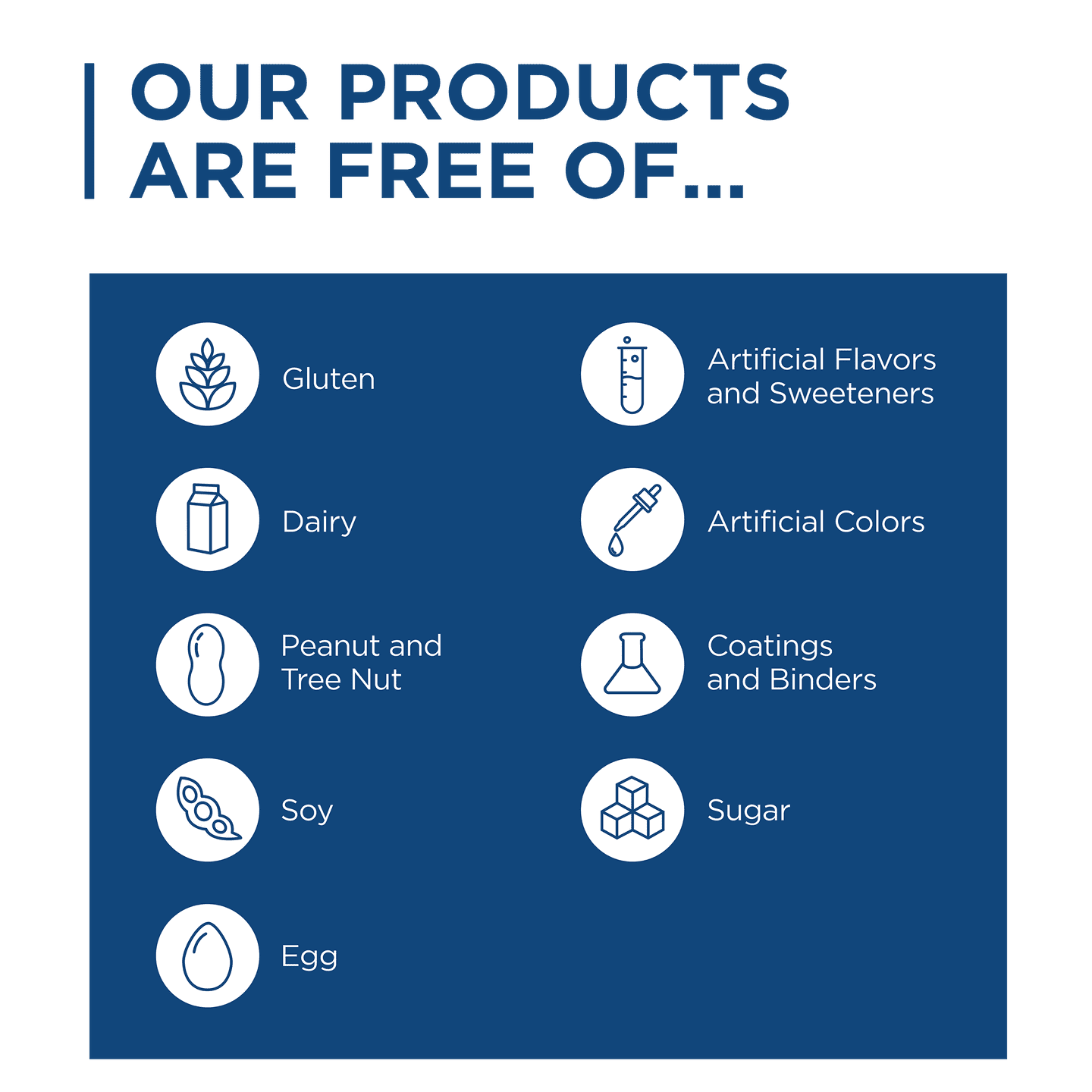 Artificial colours free, Artificial flavours free, Artificial sugar free, Dairy Free, Egg Free, Fish Free, Gluten Free, Non-GMO, Peanuts free, Seasame free, Shellfish Free, Soy Free, Tree nuts free, Unnecessary excipients free
