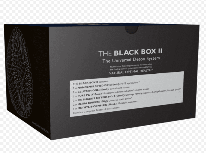 Pack size: The BLACK BOX II contains: 3 x Nanoemulsified DIM (50ml): Nrf2 upregulator* 2 x Liposomal Glutathione (50ml): Glutathione source 2 x Micellized Pure PC (120ml): Membrane stabilizer/rebuilder;* choline source 2 x BitterX (50ml): Drainage remedy, supports liver/gallbladder, kidneys, microbial balance* 2 x Ultra Binder (120 g): Broad spectrum toxin binder* 1 x Methyl B-Complex (50ml): Metabolic cofactors