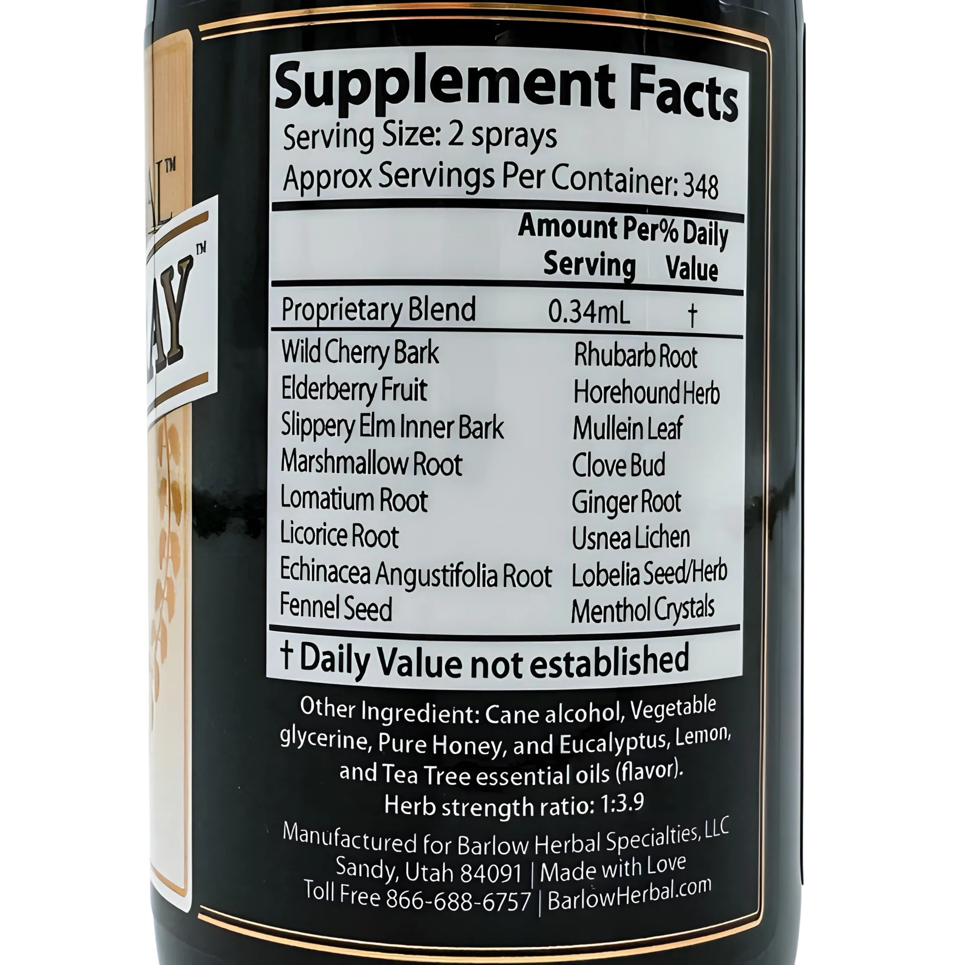 Proprietary blend (Wild Cherry Bark, Elderberry, Slippery Elm Inner Bark, Marshmallow Root, Licorice Root, Echinacea, Angustifolia Root, Lomatium Dissectum Root, Fennel Seed, Rhubarb Root, Horehound Herb, Mullein Leaf, Clove Bud, Ginger Root, Usnea Lichen, Lobelia Seed/Herb Pod, Menthol Crystals, essential oils of Eucalyptus, Lemon & Tea Tree, Vegetable Glycerin, Pure Honey) | 0.34ml | |